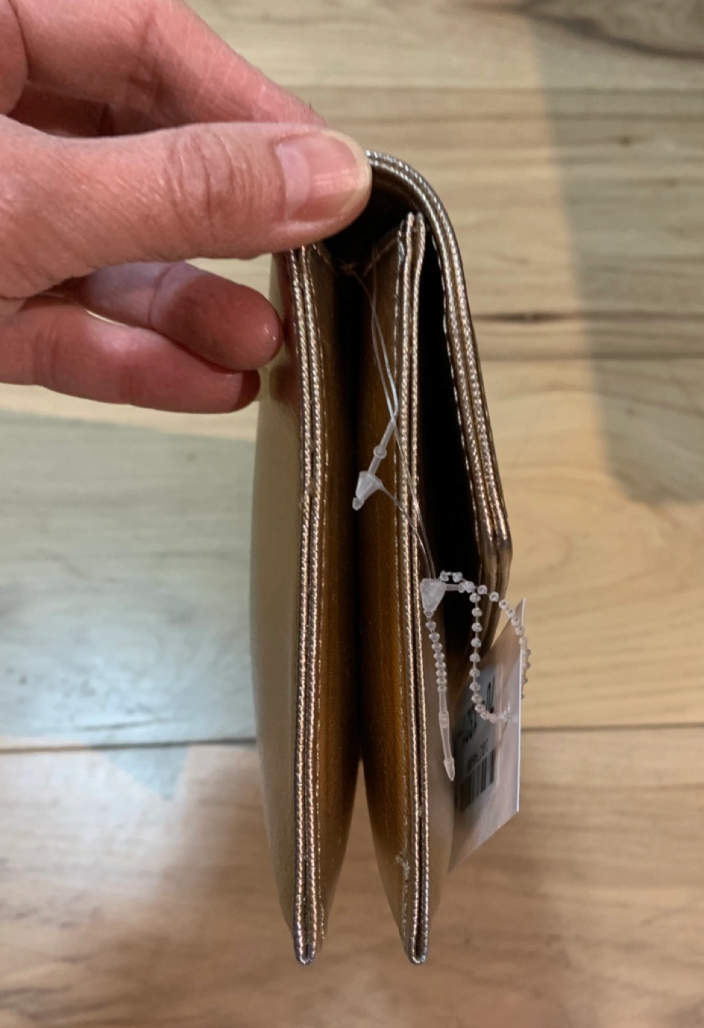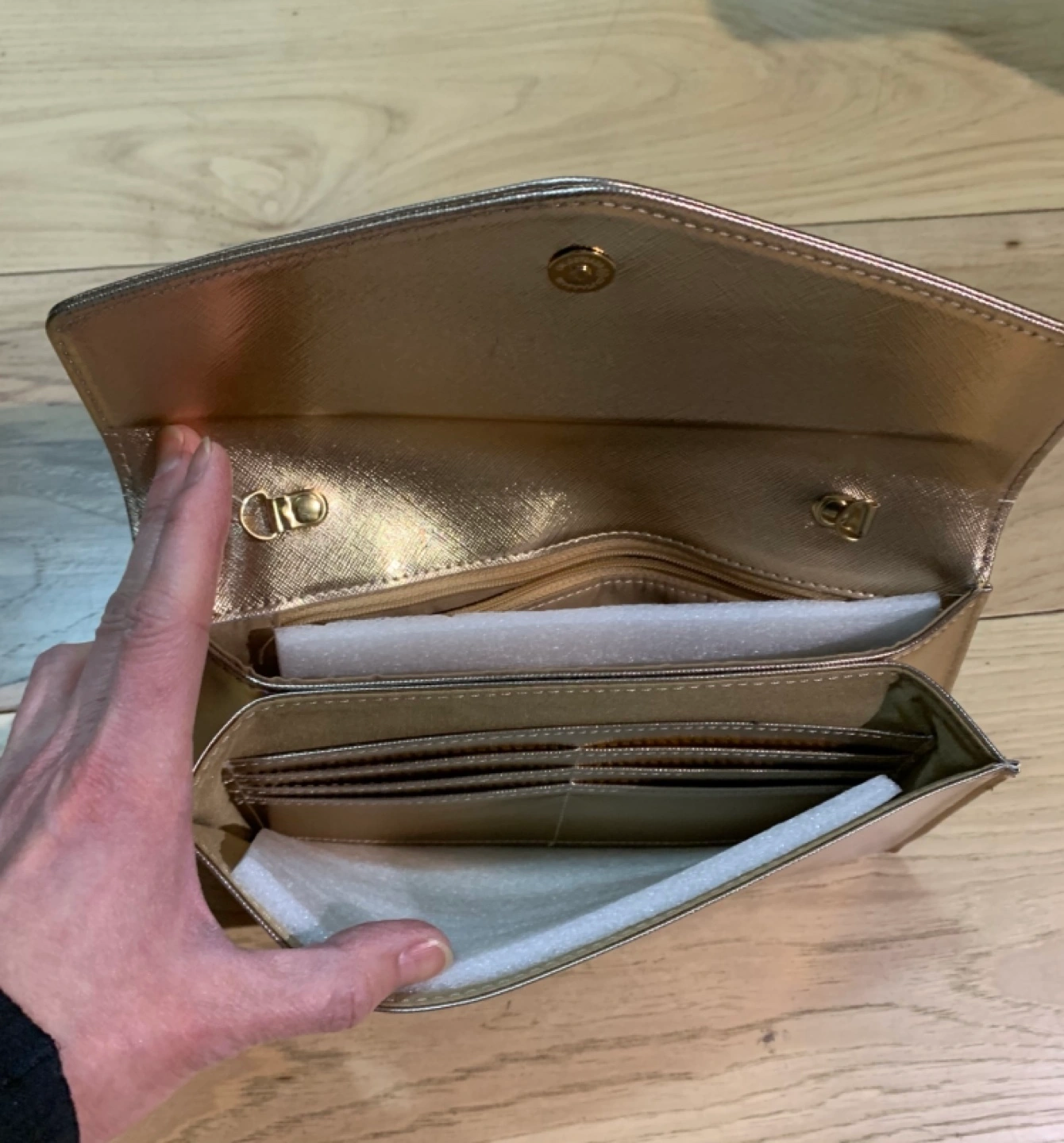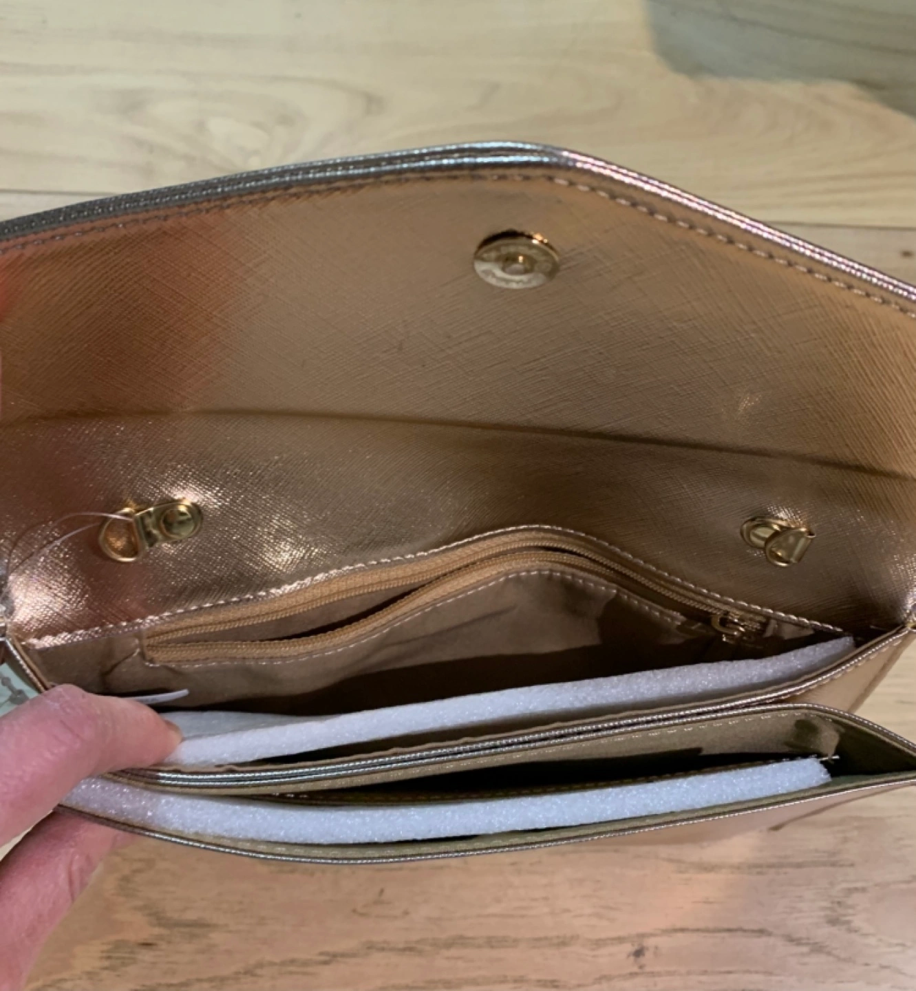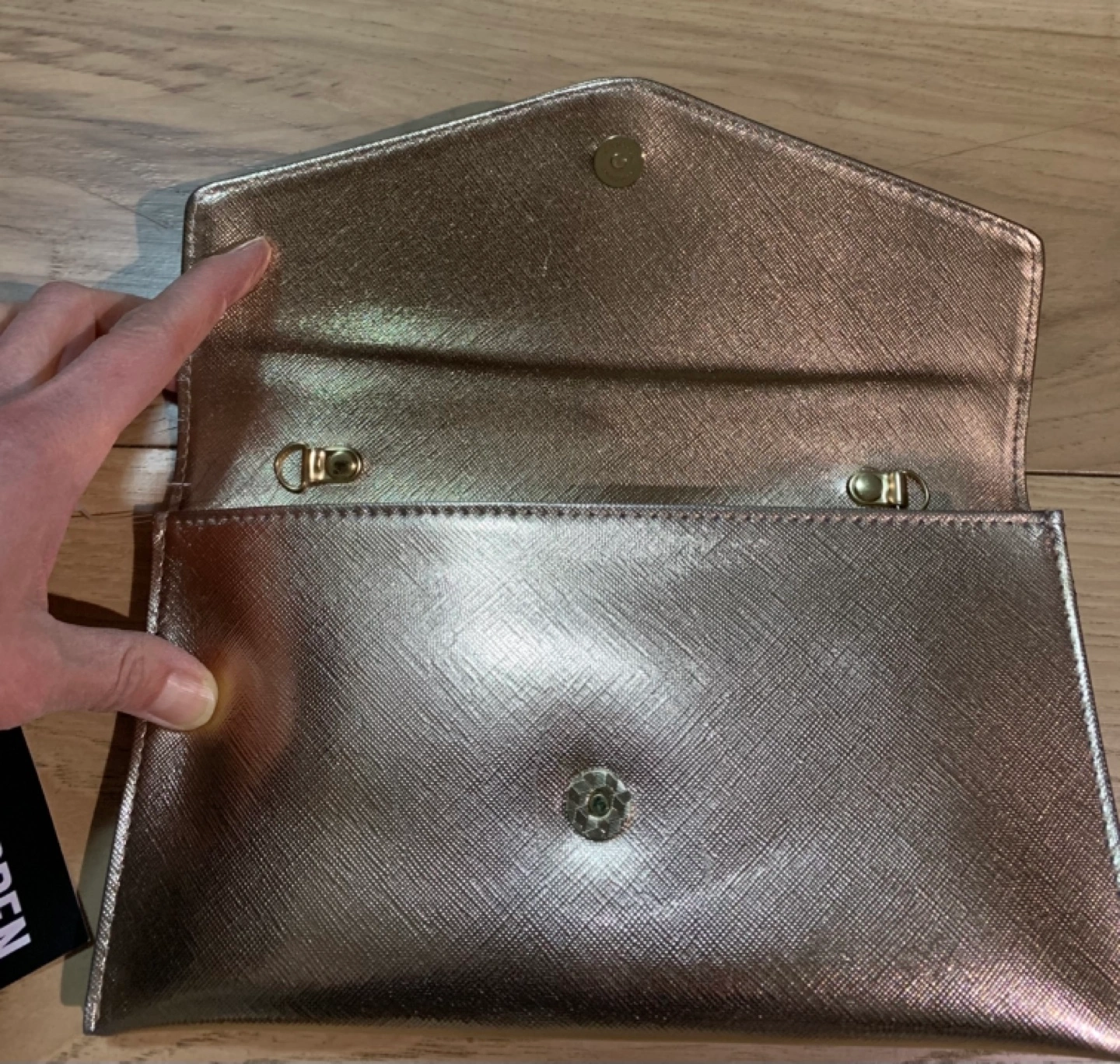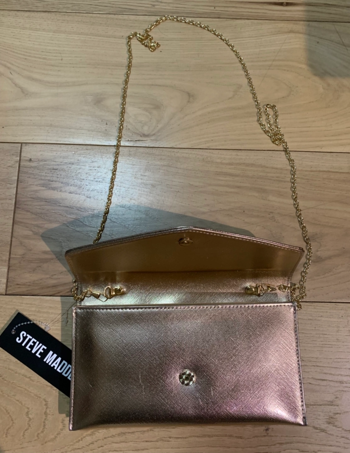 Gold metallic clutch. Brand new never used with tag on. Features a flap closure and detachable chain strap. Interior includes multiple compartments. New with tags.