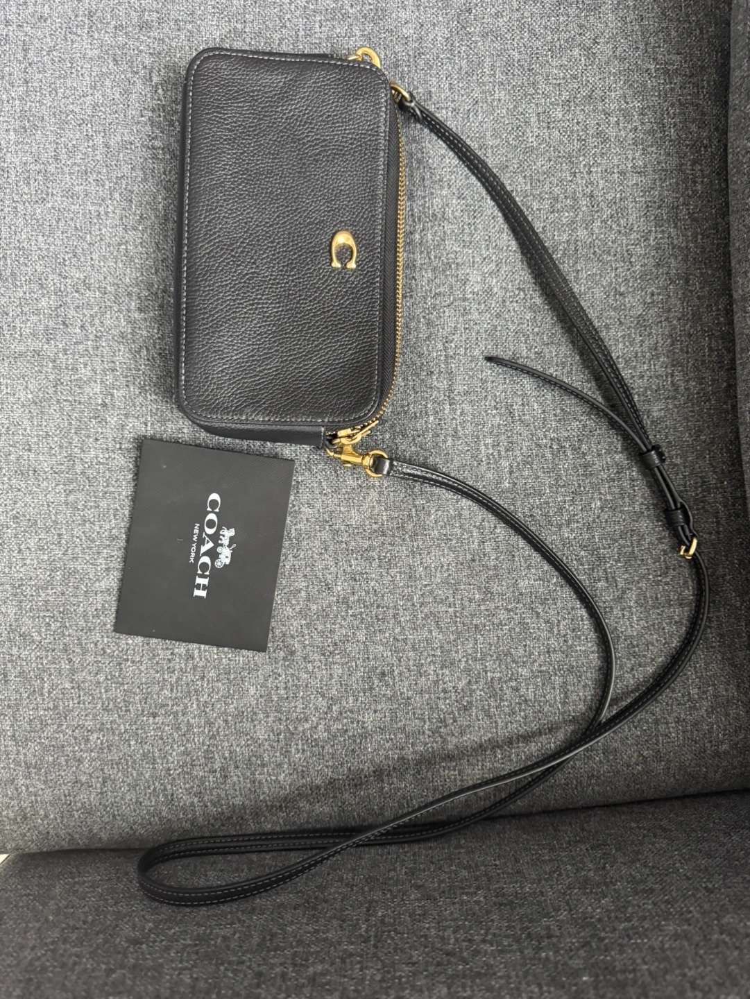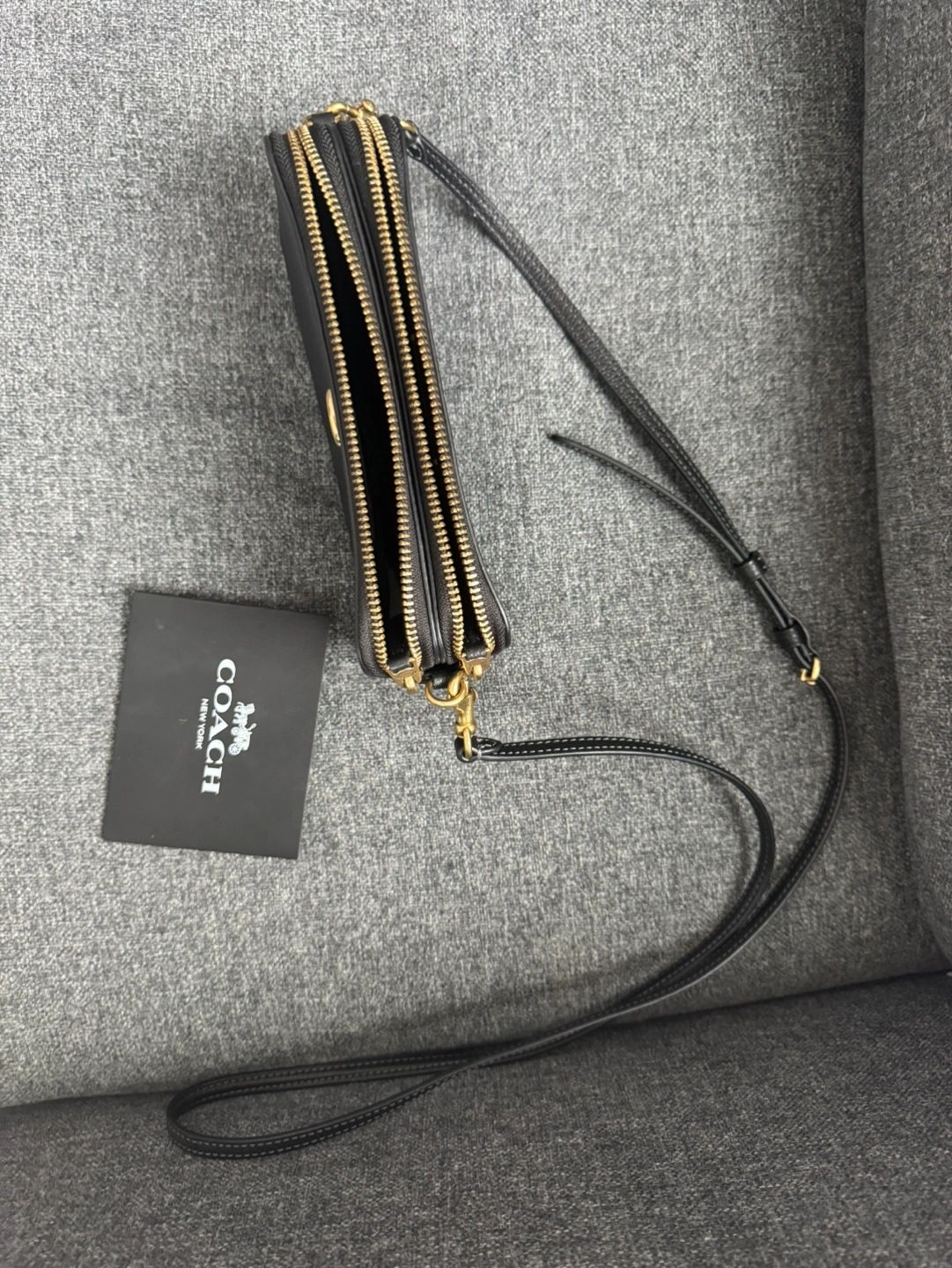 Small black leather crossbody bag. Features gold hardware and a long adjustable strap. Double zipper closure. Excellent condition.