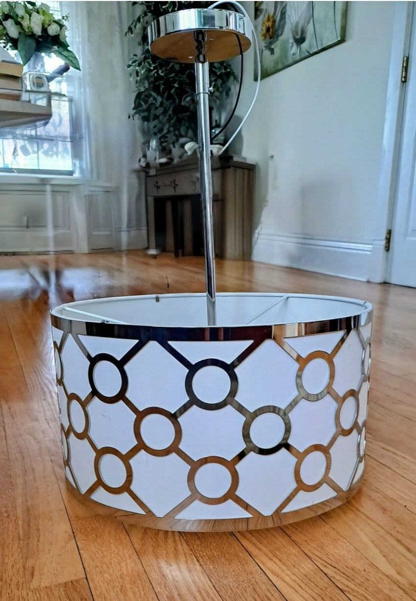 Ceiling mount drum chandelier (3-light) with white shade and chrome frame.