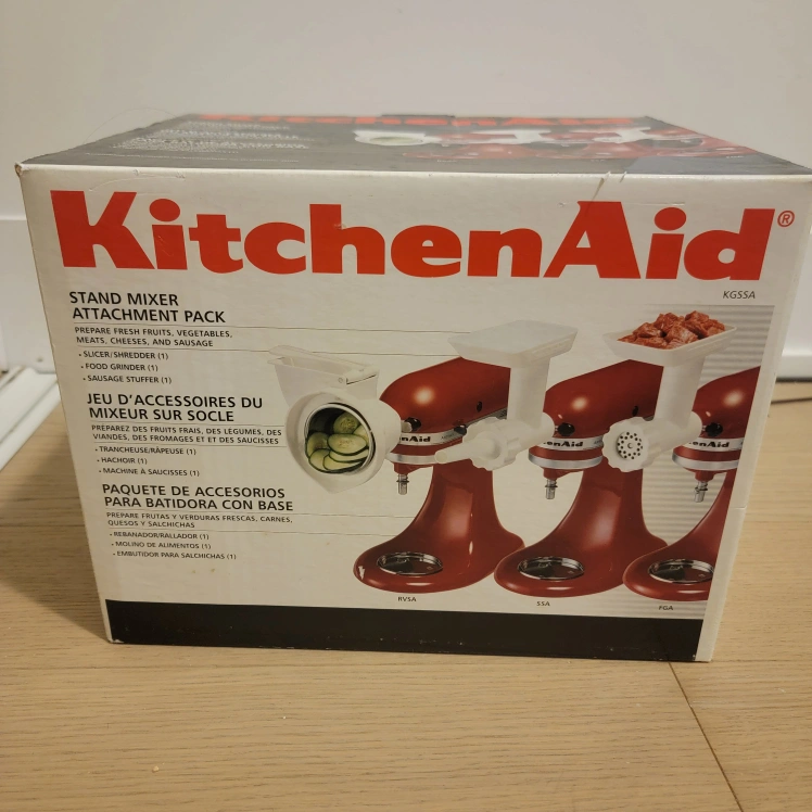 KitchenAid stand mixer attachment pack. Includes food grinder attachment. Missing knife (Replacement can ordered in Amazon). Slicer/shredder and sausage stuffer.