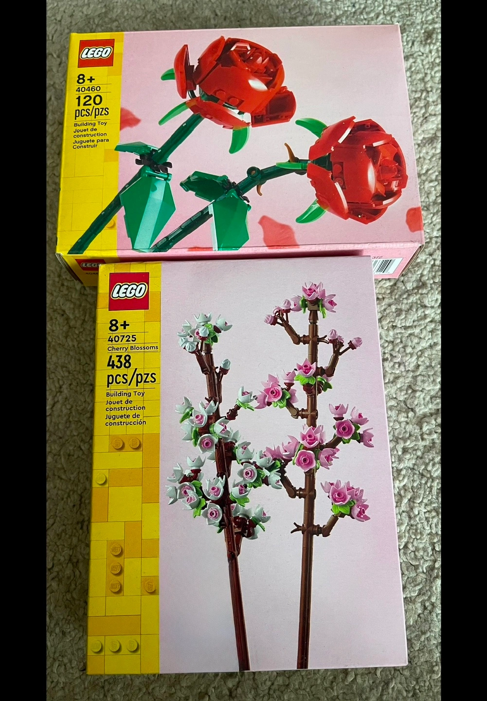 Two unopened LEGO sets. Roses set #40460 and Cherry Blossoms set #40725. New in box. Perfect gifts or for your own collection. Sets sold individually and/or together.