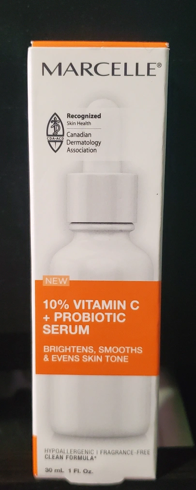 New Marcelle 10% Vitamin C + Probiotic Serum. 30 mL. Brightens, smooths, and evens skin tone. Hypoallergenic and fragrance-free. Suitable for sensitive skin.