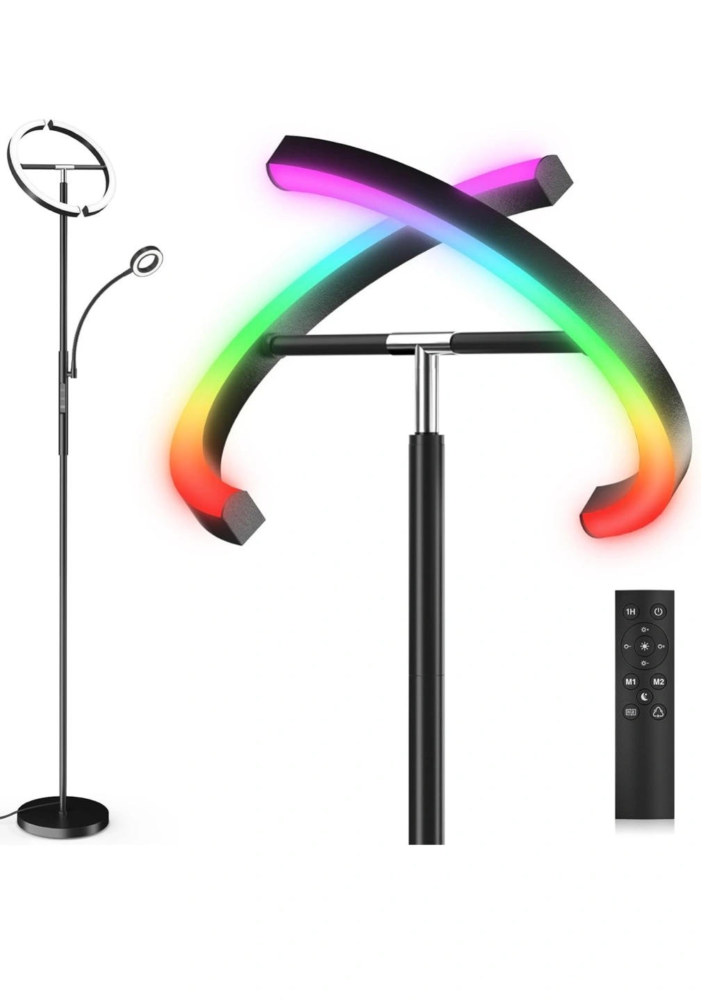 Modern floor lamp. Features adjustable colour temperature and RGB lighting modes. Touch and remote controls. 360° rotation. Multiple lighting options for reading, working, or ambiance. Includes a smaller adjustable reading lamp.