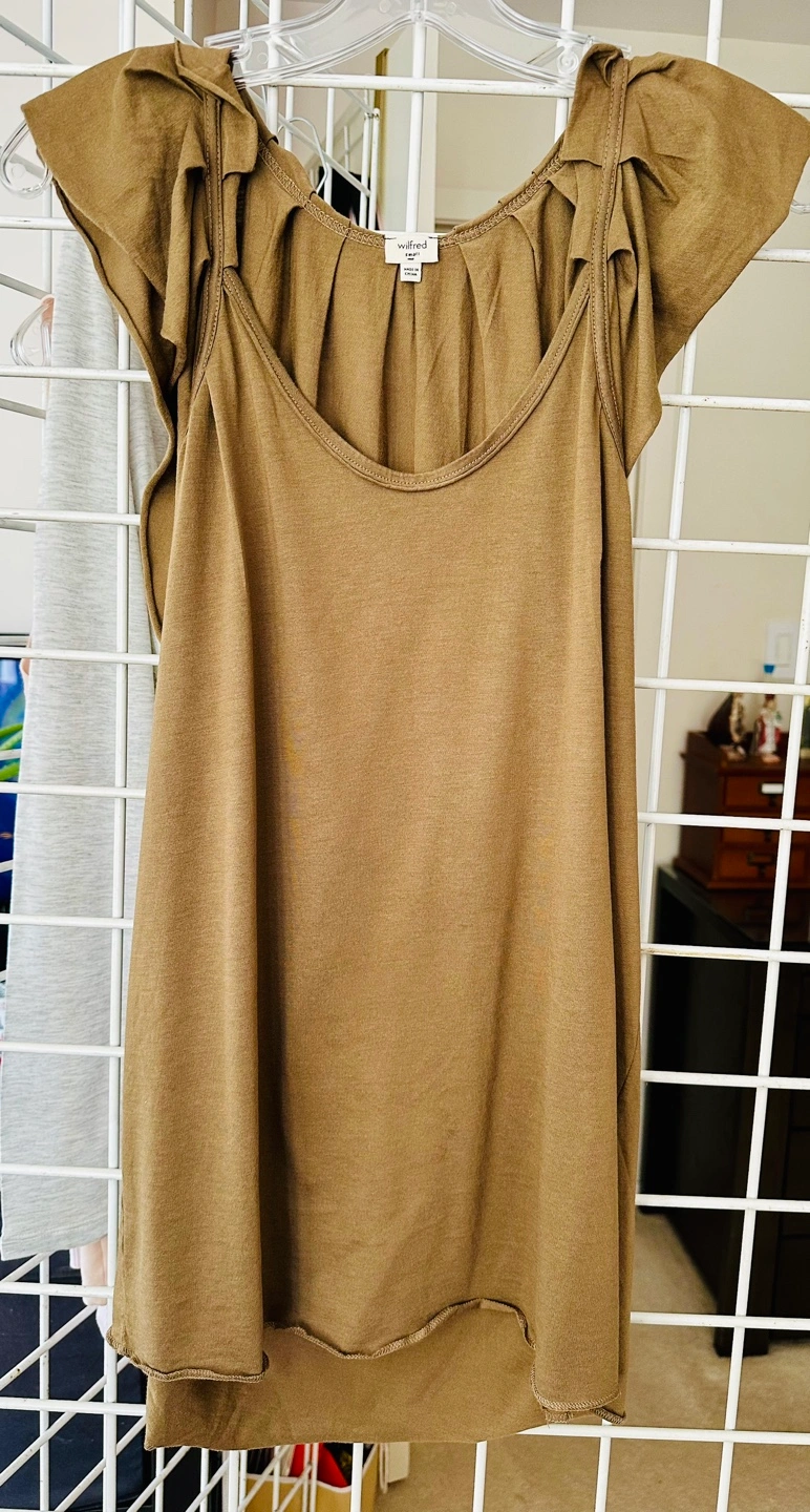 Olive brown sleeveless blouse. Small flutter sleeves. Pleated detail at neckline. Relaxed fit. Size small.