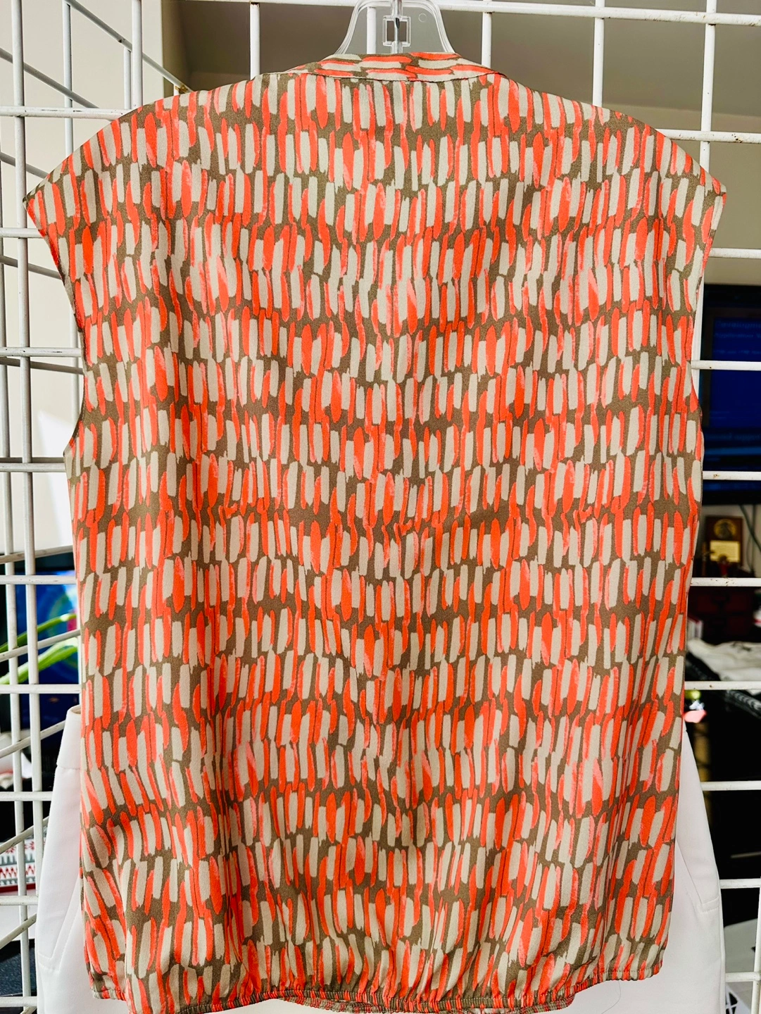 Women's sleeveless blouse. Size extra small. Peach and grey abstract print. Made in China. V-neck.