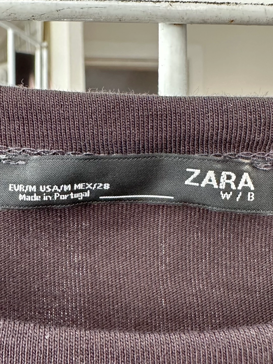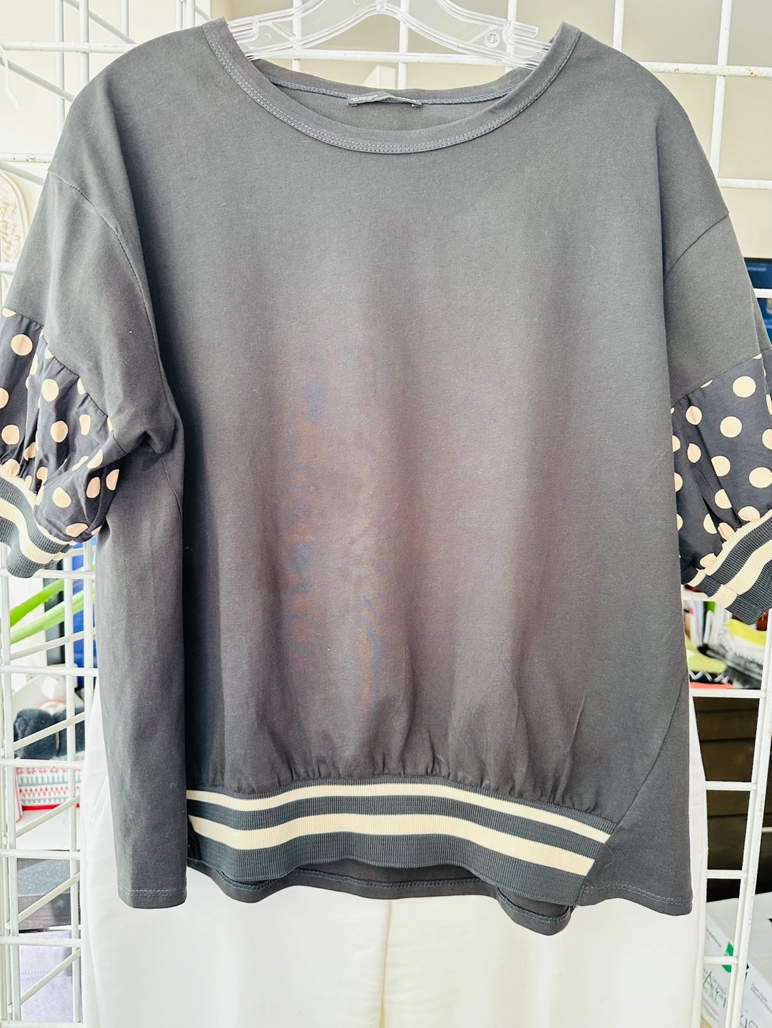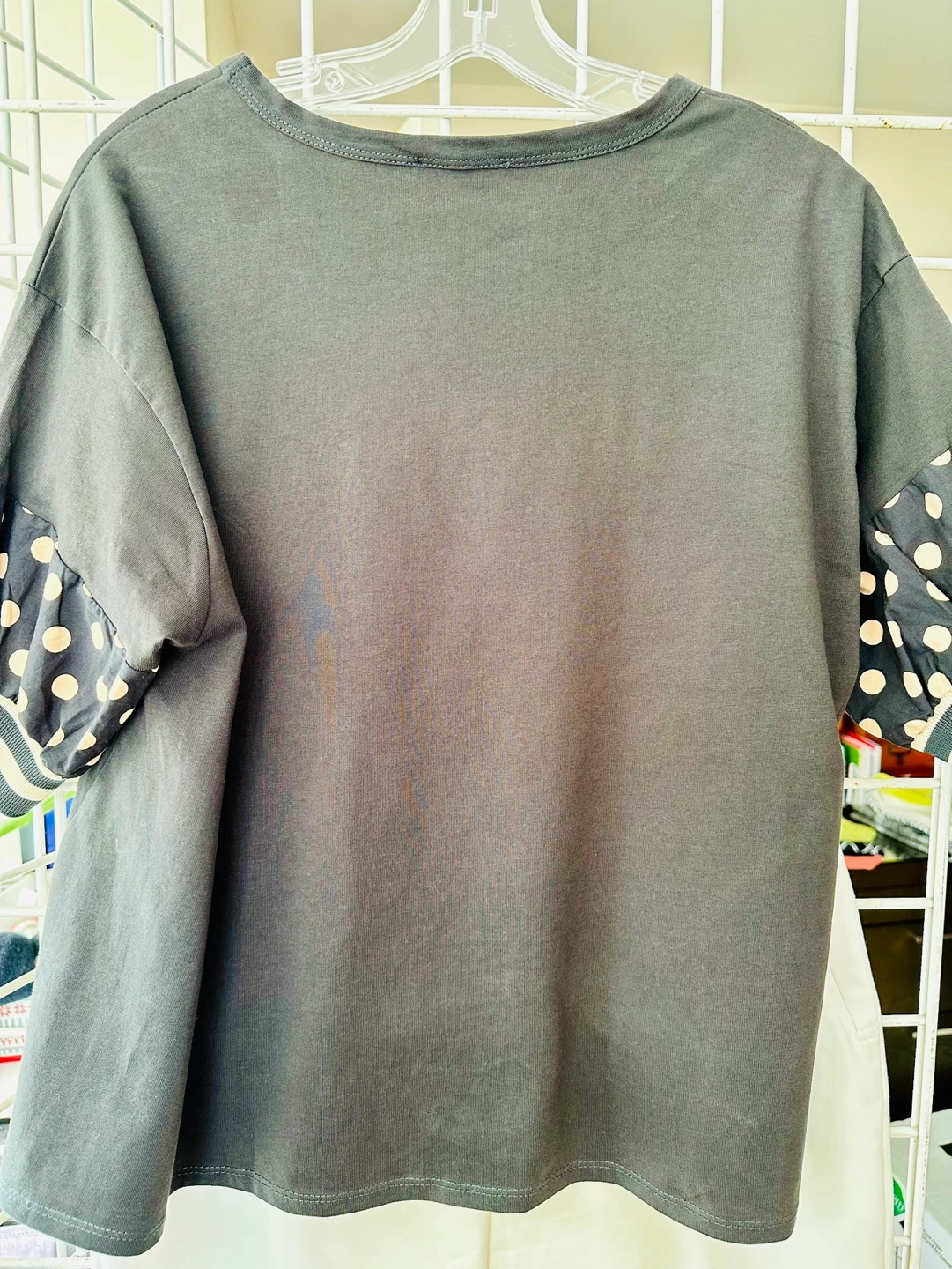 Boxy short-sleeved top. Polka dot pattern on sleeves. Size Medium. Made in Portugal.