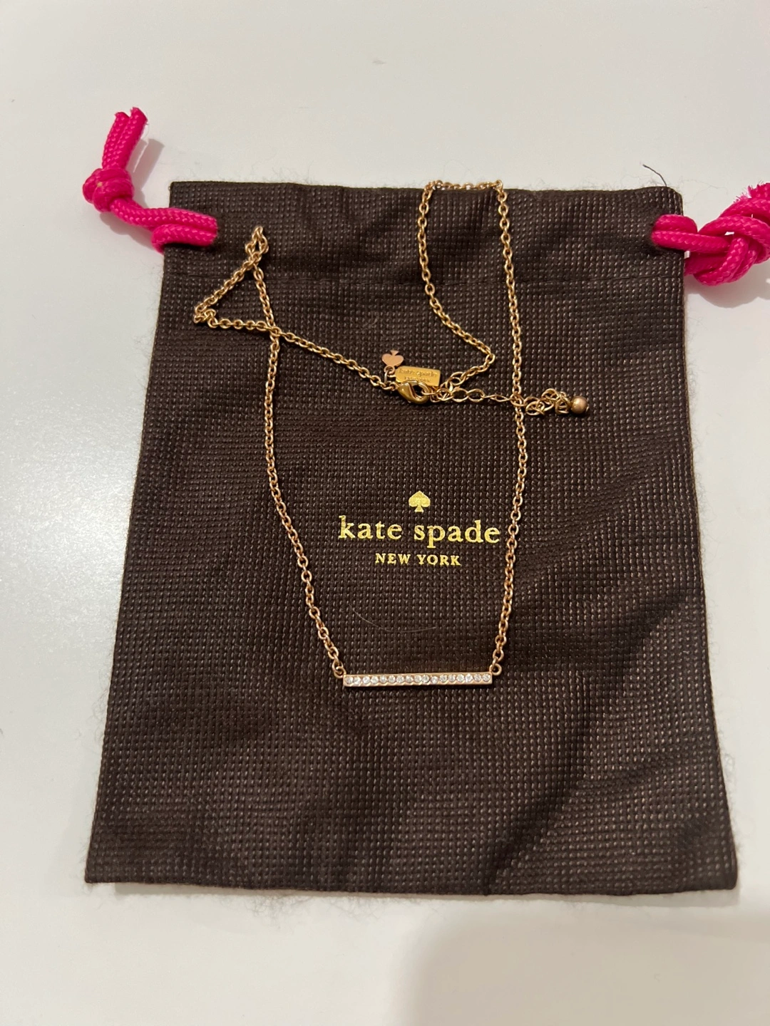 14k gold plated rose gold chain necklace. Features a small horizontal bar adorned with clear stones. Comes in a Kate Spade dust bag.
