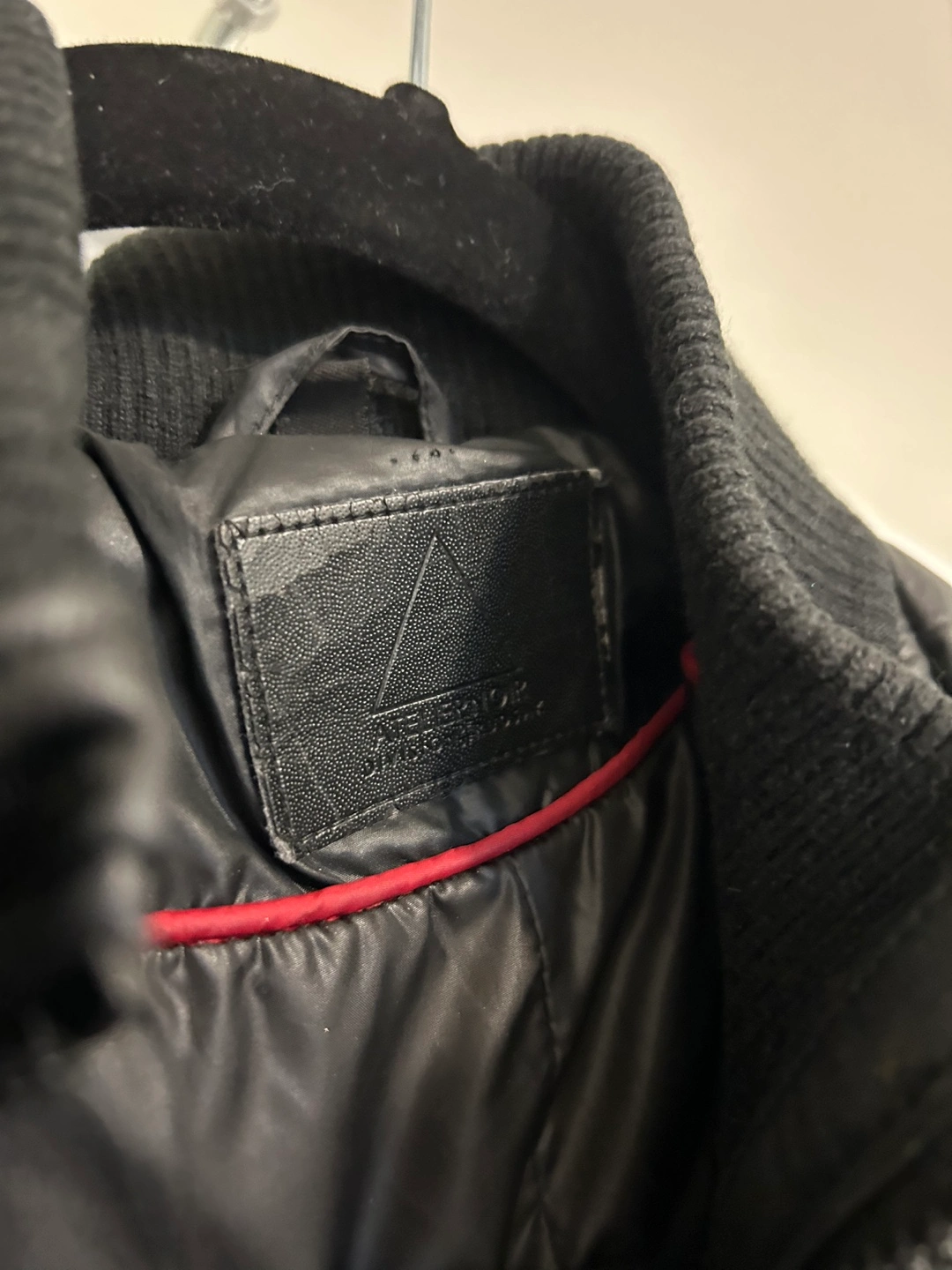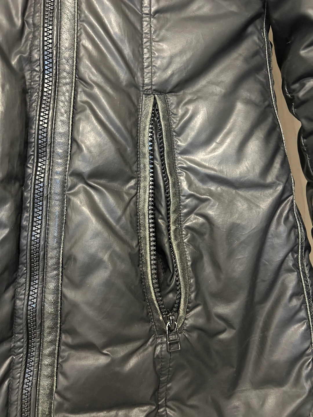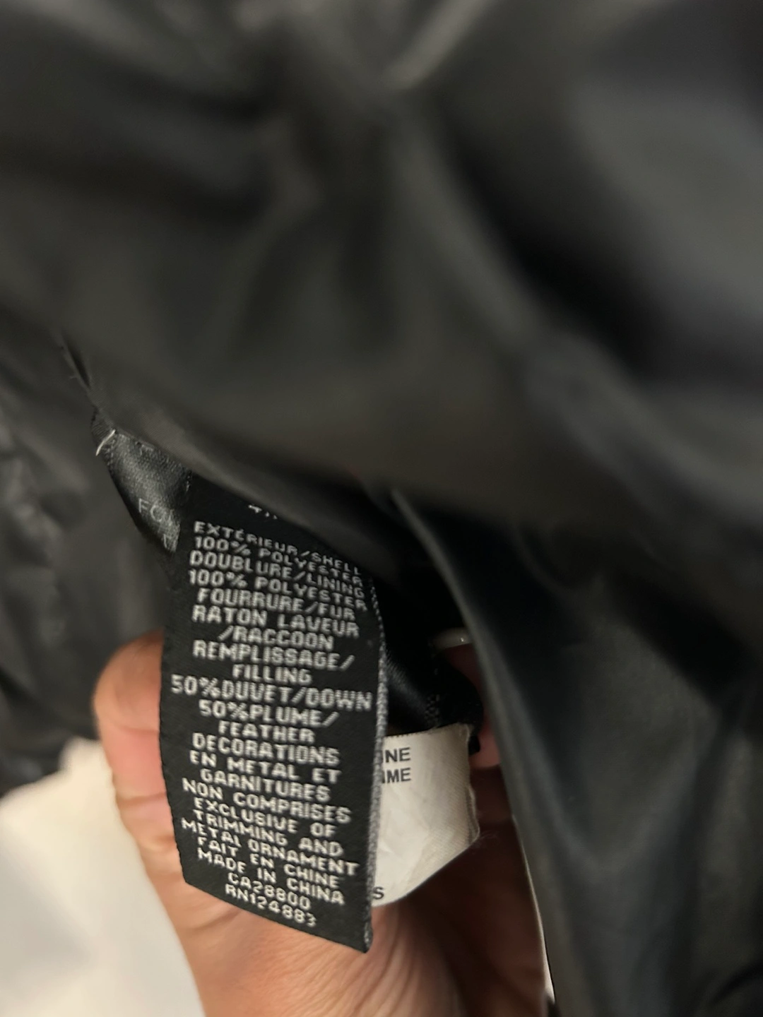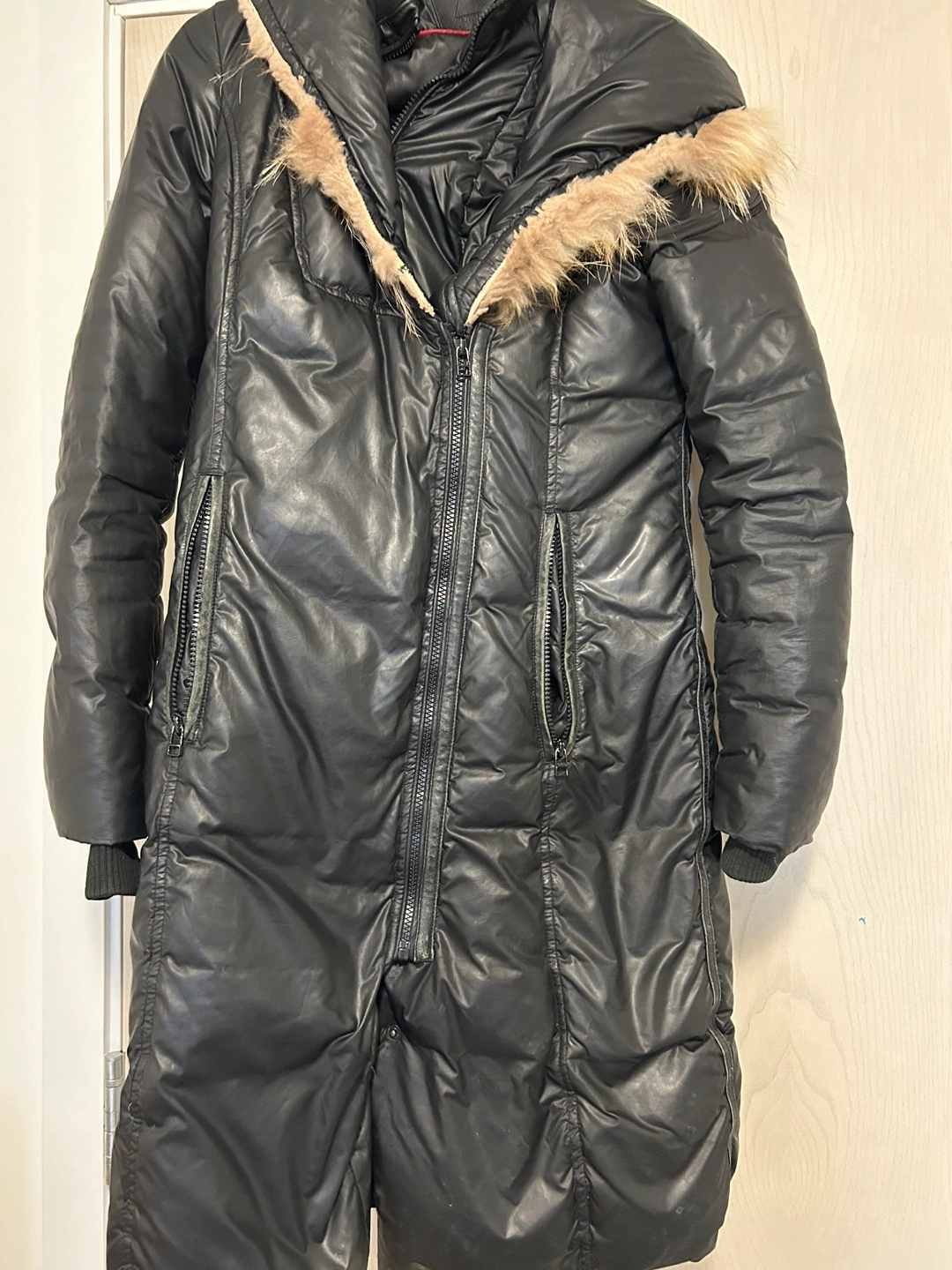 Long black puffer coat. Features a faux fur trimmed hood and zipper closure. Zippered pockets. Excellent for colder weather.