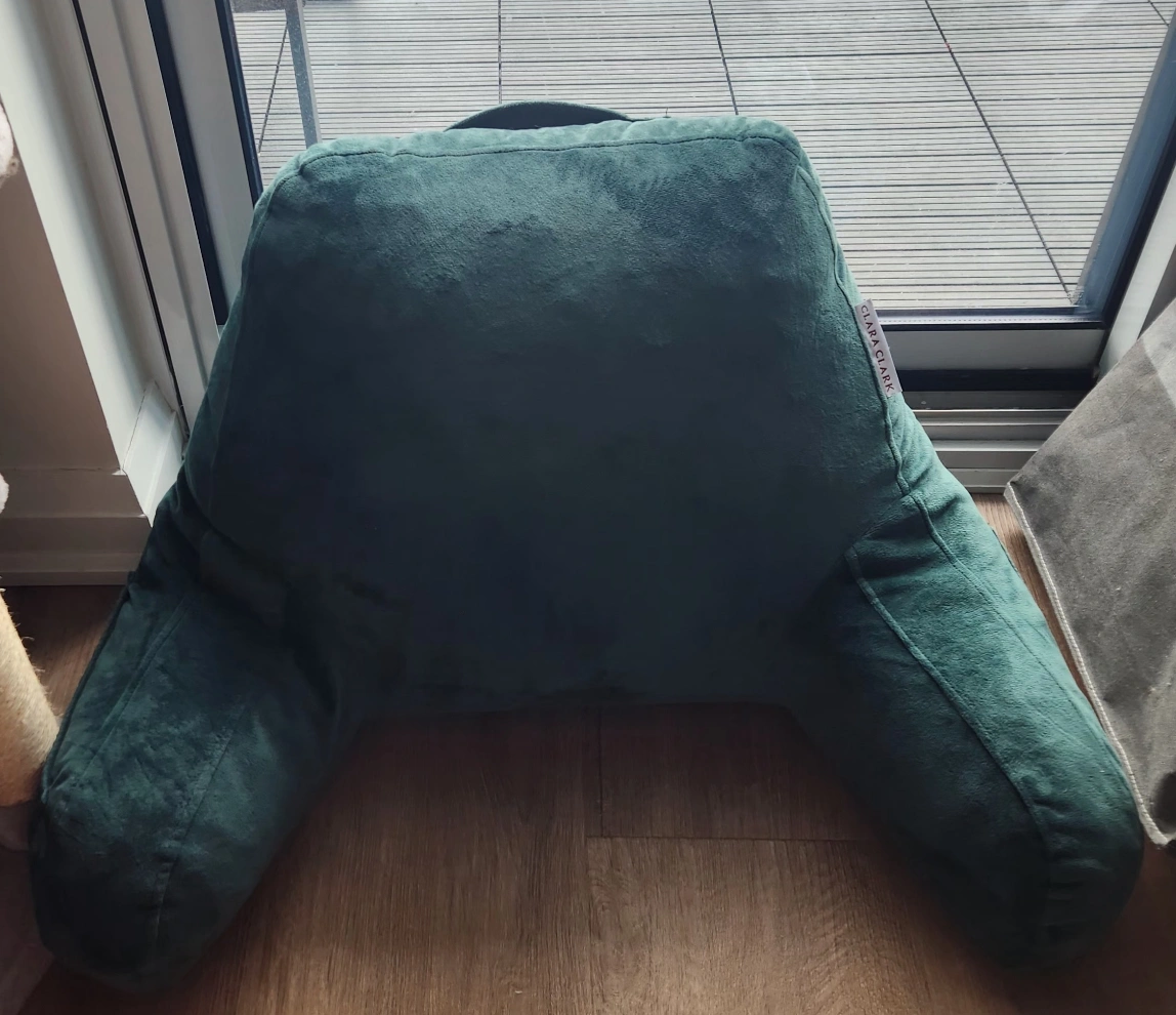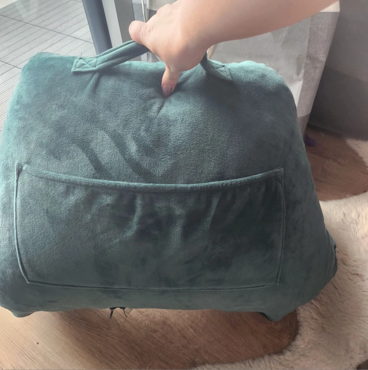 Soft, dark green bed rest pillow. Features a convenient handle and small pocket. Perfect for lounging and reading in bed or on the couch.