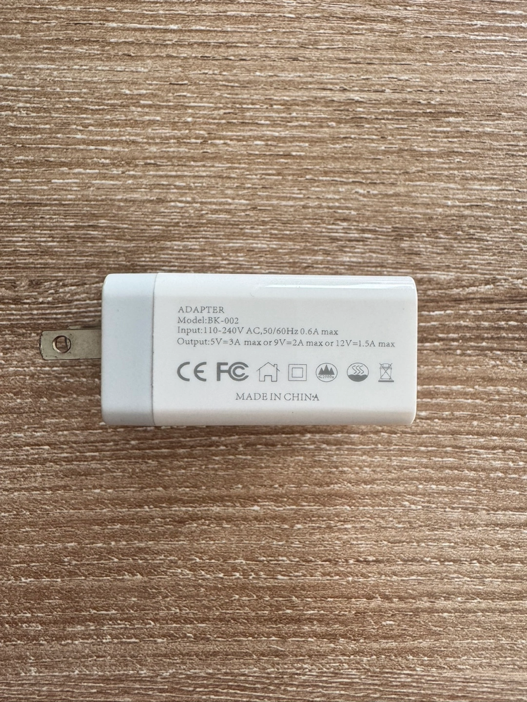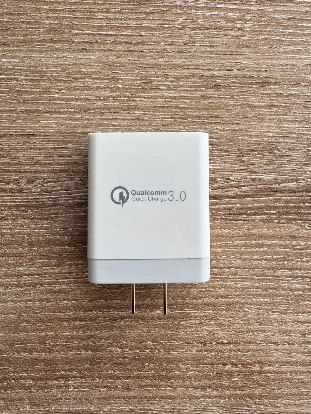 White USB wall charger. 18W fast charging. Features Qualcomm Quick Charge 3.0 technology. Compact design. Model: SK-002. Input: 100-240V AC, 50/60Hz, 0.6A max. Output: 5V=3A max or 9V=2A max or 12V=1.5A max