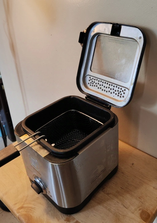 Stainless steel deep fryer. Includes removable fry basket and filter. Adjustable thermostat control.