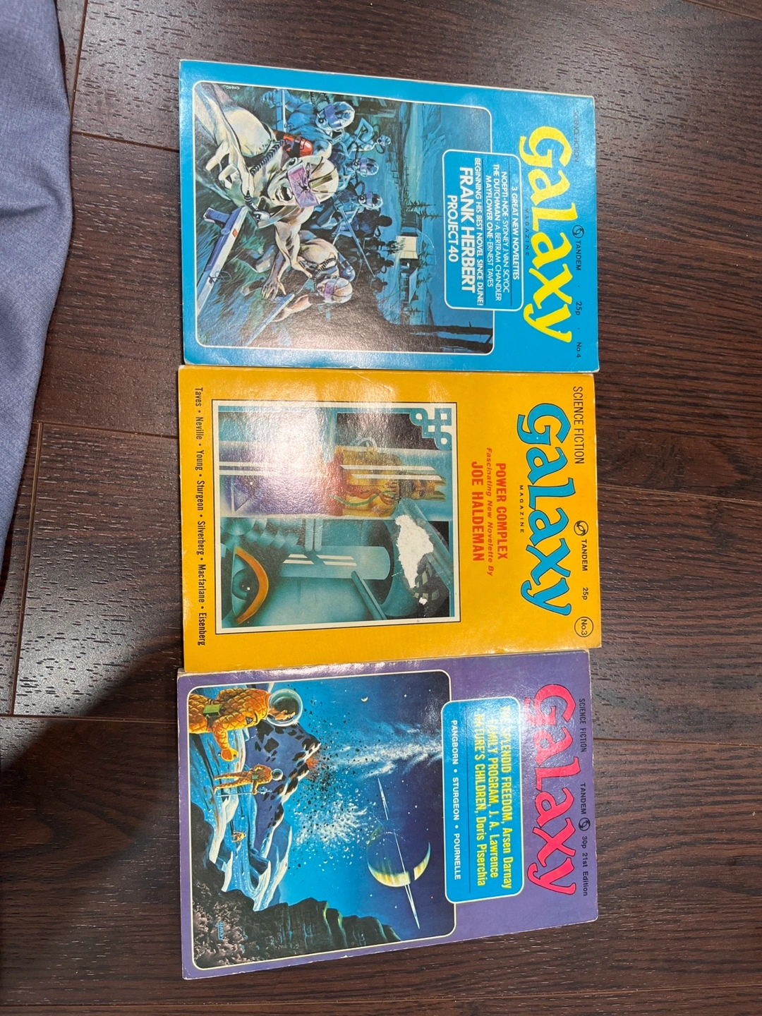 Collection of three vintage Galaxy Science Fiction magazines. Features stories by Frank Herbert, Joe Haldeman, and others. Various issue numbers.
