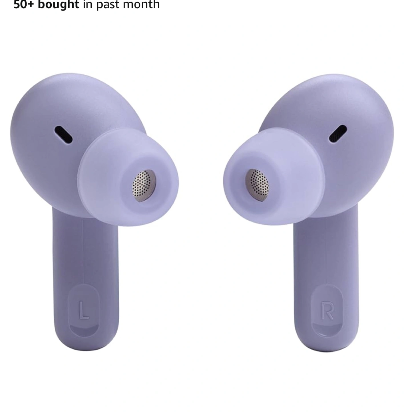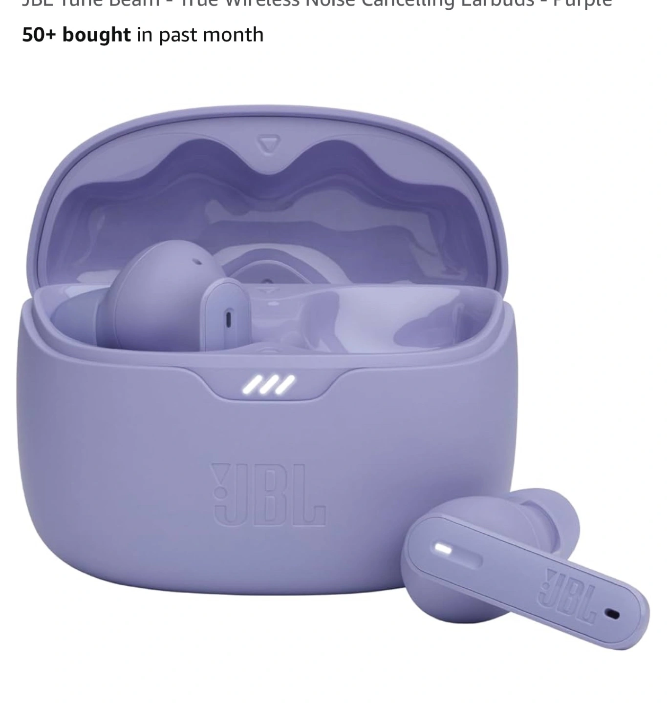 Purple JBL Tune Beam earbuds. Active noise cancellation. Crisp, clear calls. Pure bass. Includes charging case. In-ear fit.