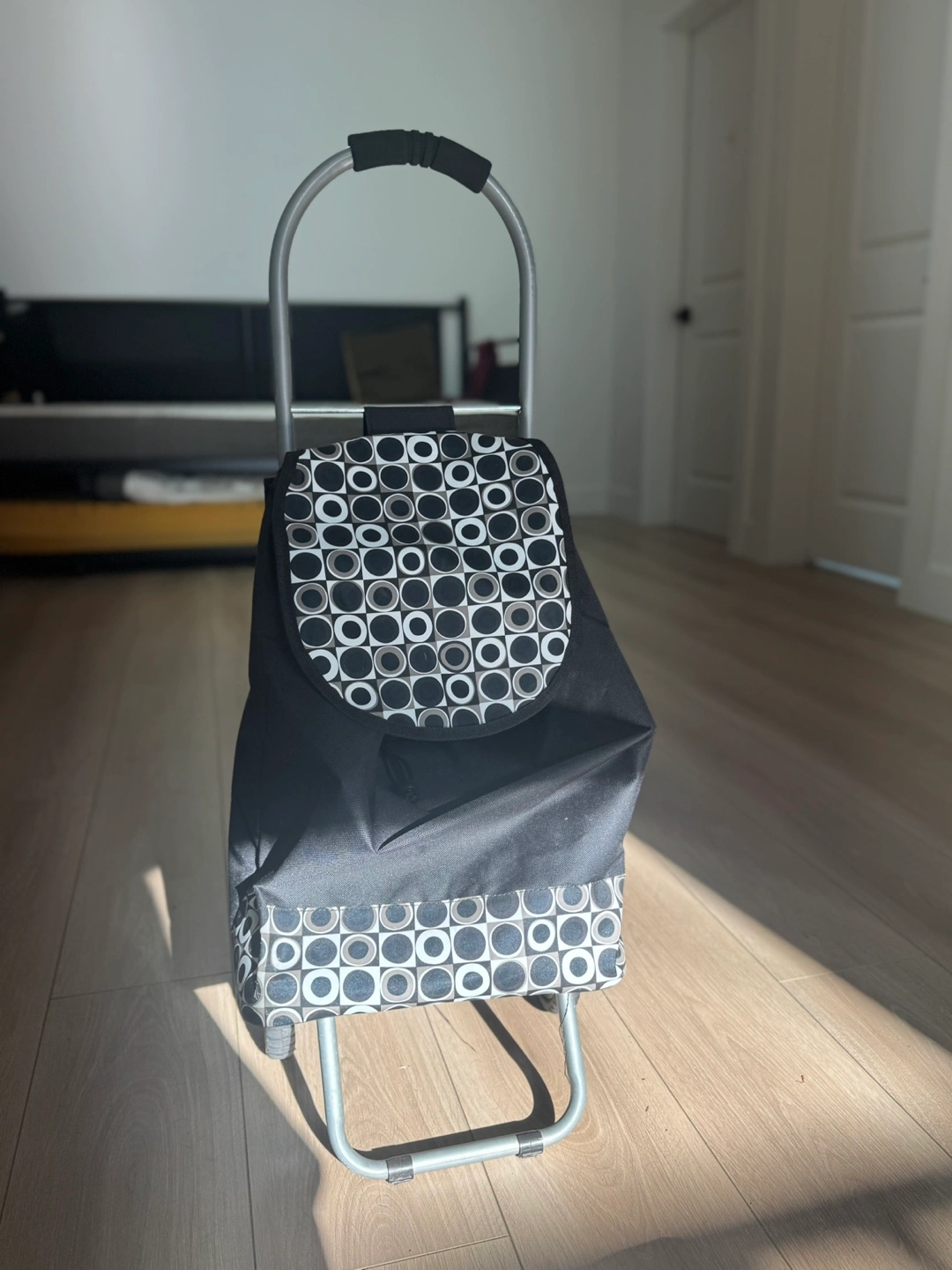 Grocery cart, foldable design, black and white geometric pattern. Lightweight and easy to manoeuvre. Great for shopping or carrying items.