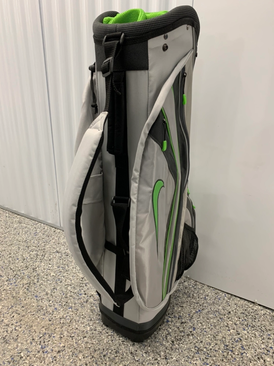 Brand New. Nike golf stand bag. Grey and lime green colour scheme. Multiple pockets and compartments. Durable and lightweight design. Perfect for carrying clubs on the course.