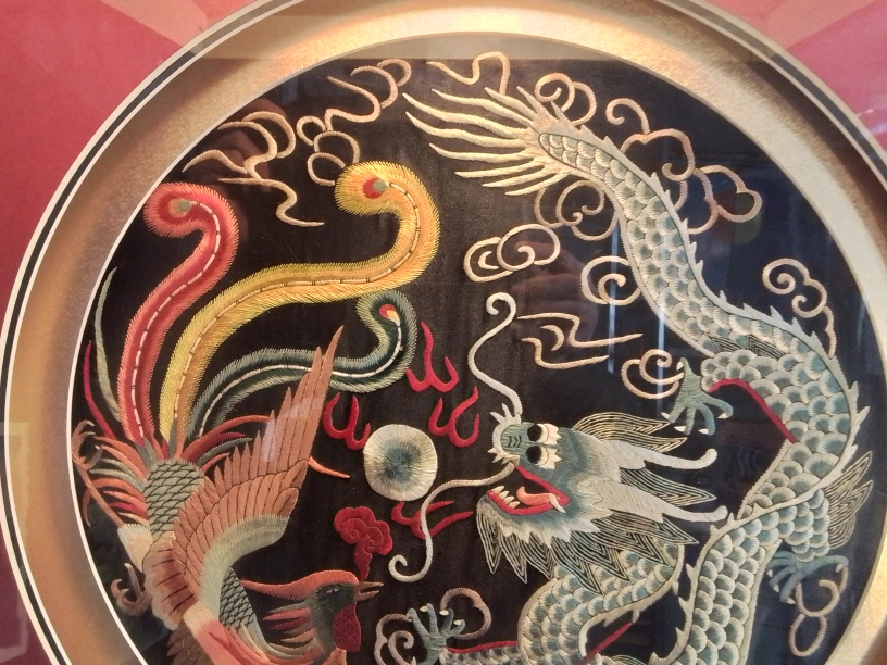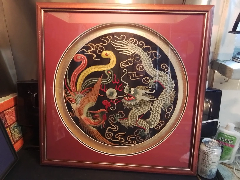 114Framed Chinese Embroidery of Dragon and Phoenix Beautiful framed circular piece. Features detailed embroidery of a dragon and phoenix on black silk. Intricate gold accents. Wood frame. Unique piece for home décor. Measurements 21.5 x 21.5 Pickup at Young Street and Steels Ave