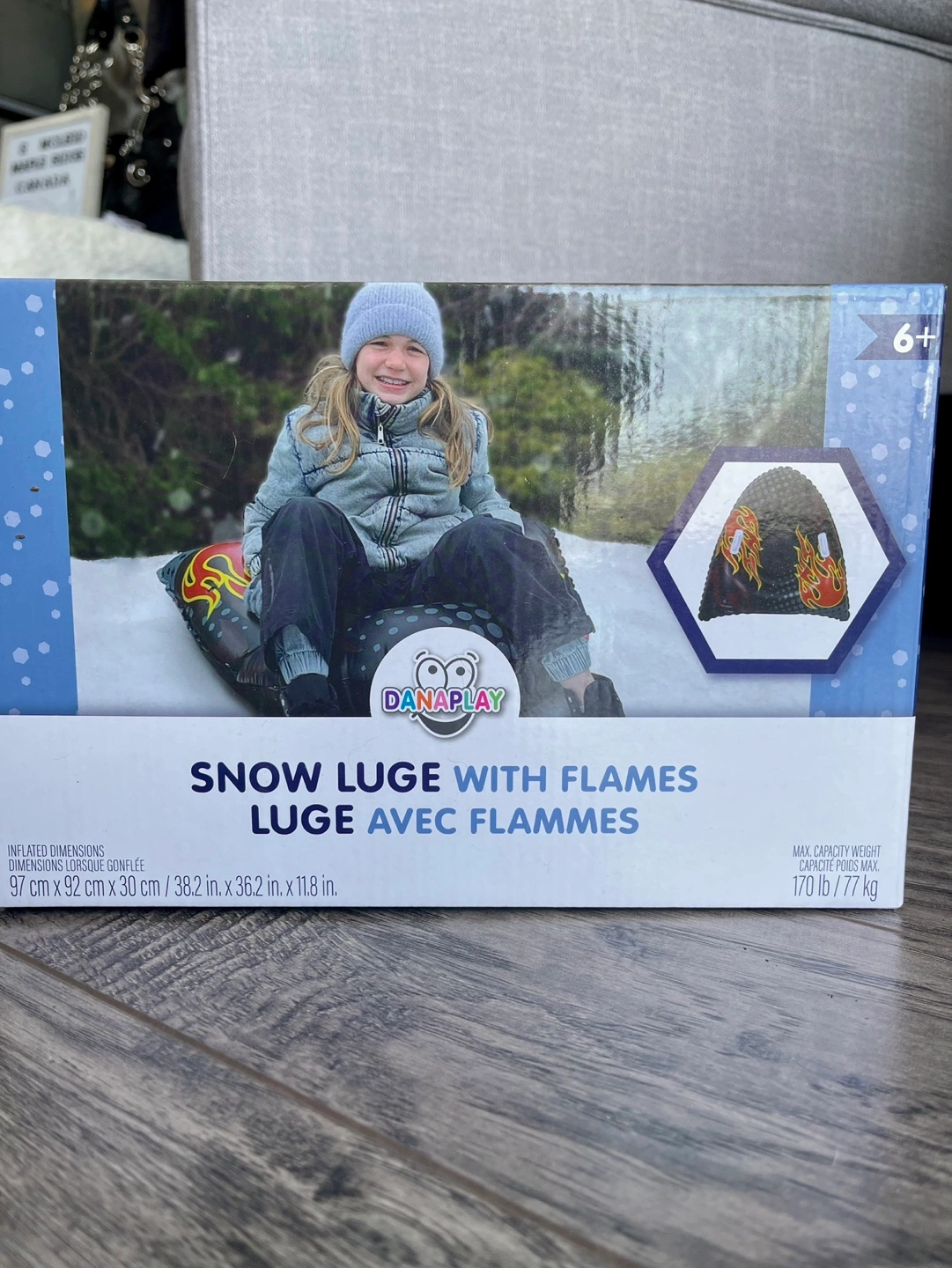 Inflatable snow luge. Flames design. Suitable for ages 6+. Maximum weight capacity 170 lbs / 77 kg. Dimensions: 97 cm x 92 cm x 30 cm / 38.2 in. x 36.2 in. x 11.8 in. Pick up in east Maple Ridge