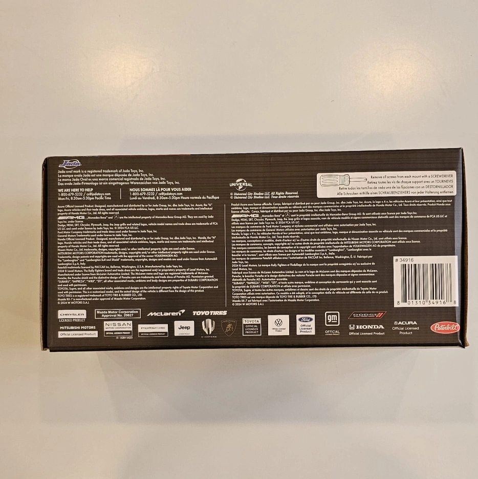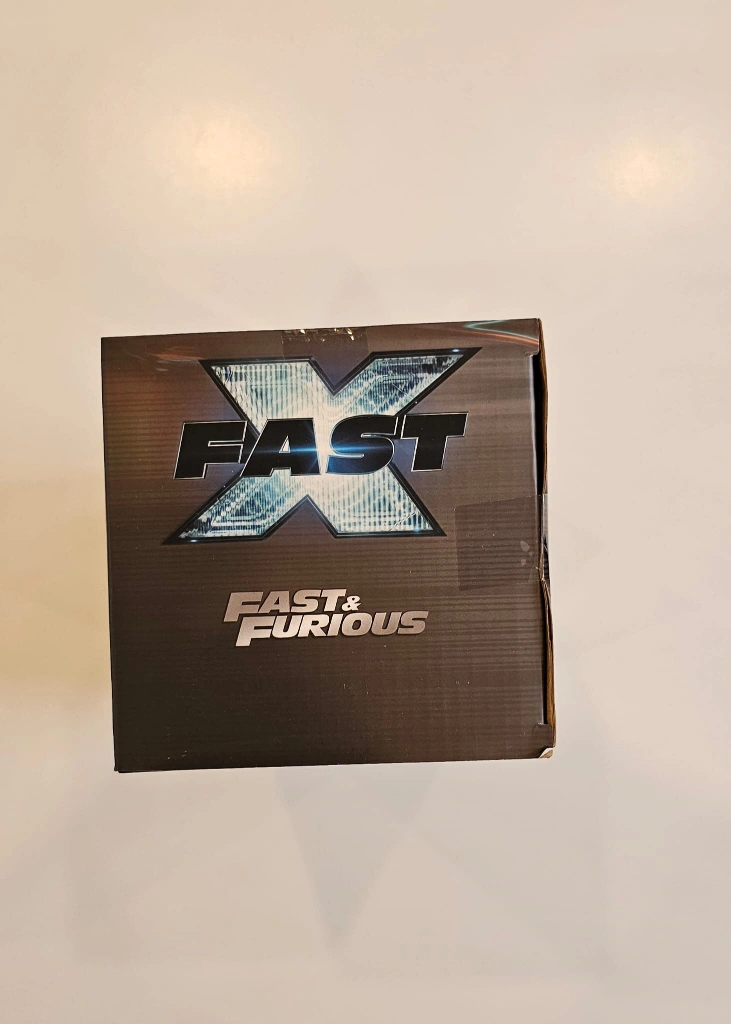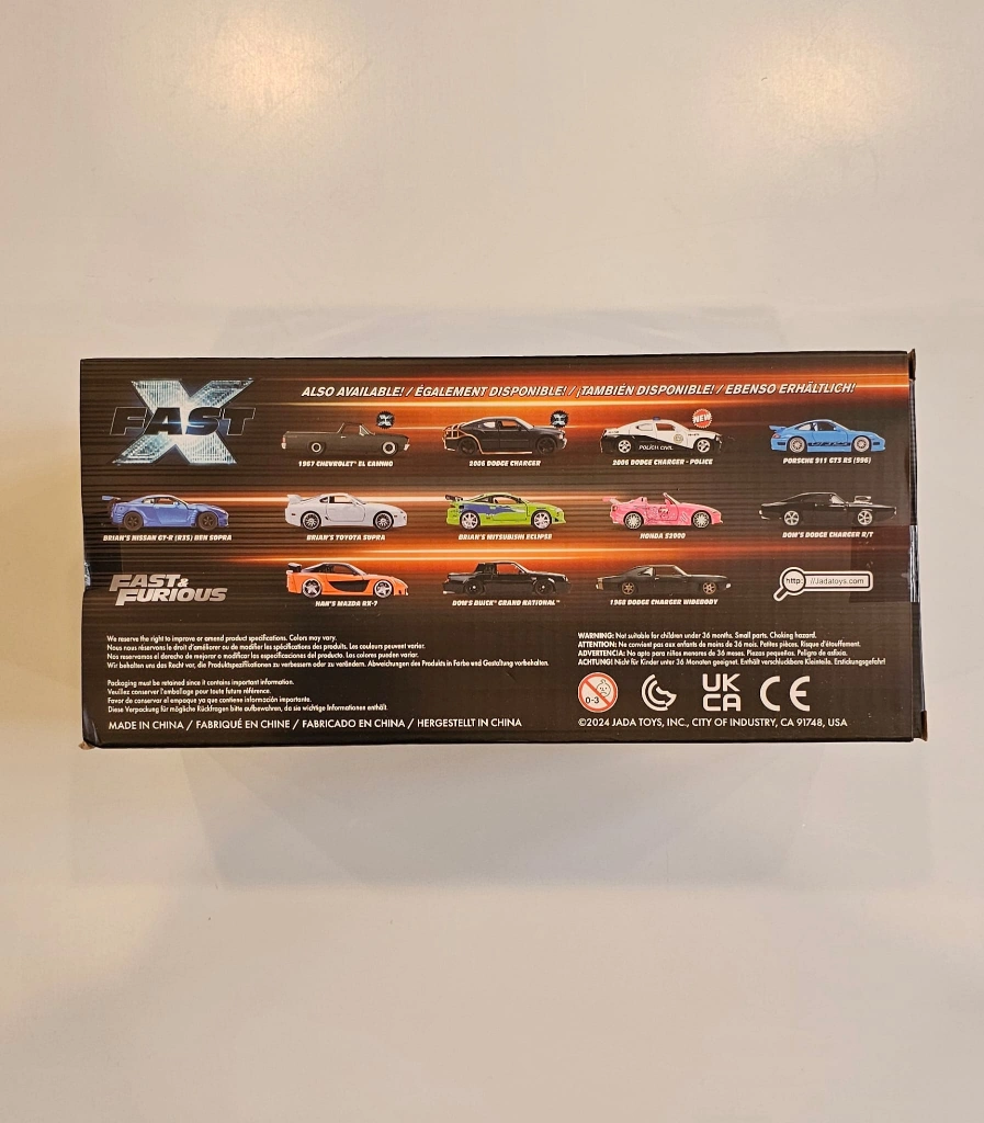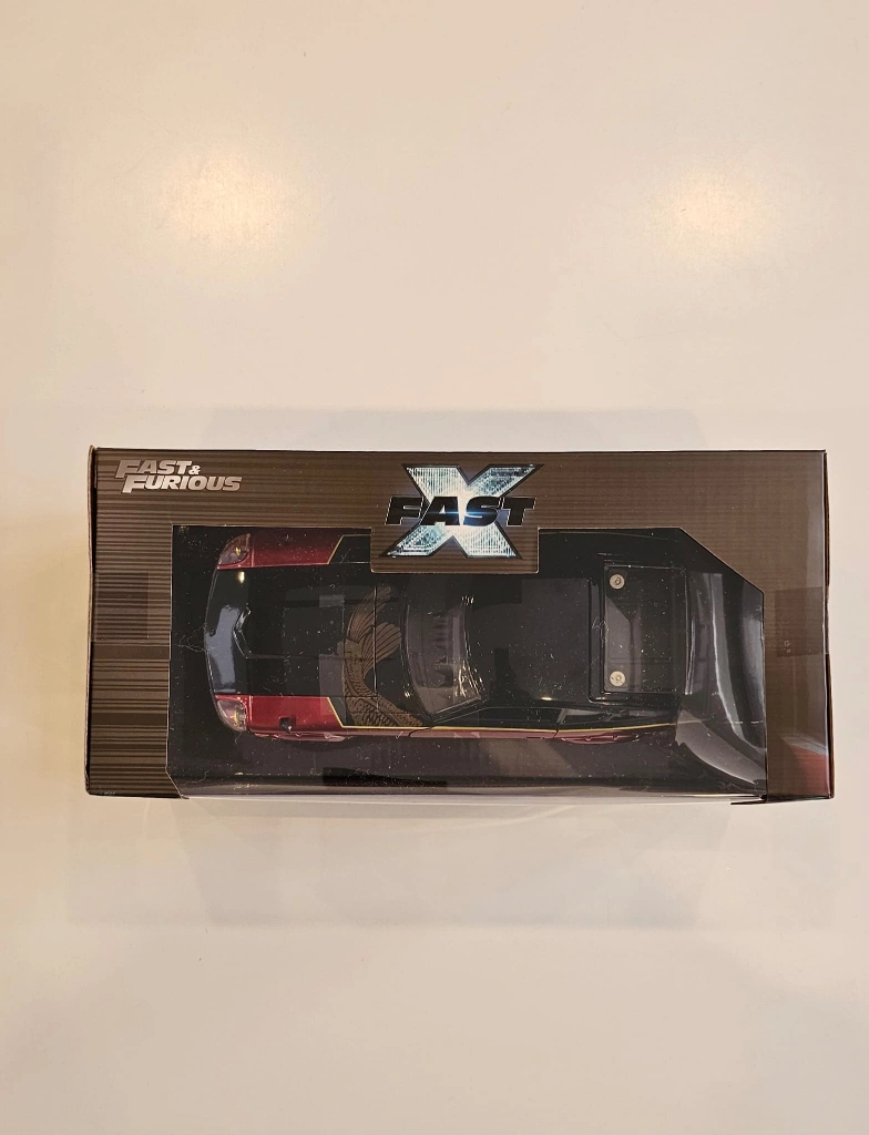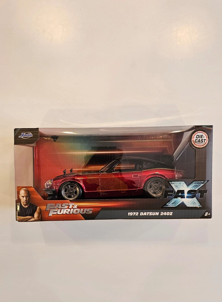 New in box. 1:64 scale diecast model car. Features a red and black 1972 Datsun 240Z. Part of the Fast X movie collection. Collectible item for fans.