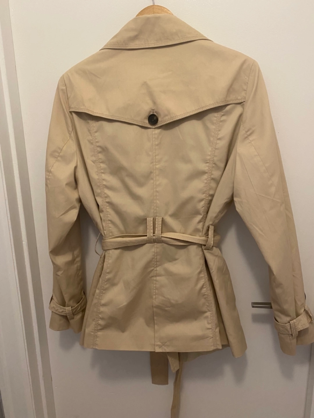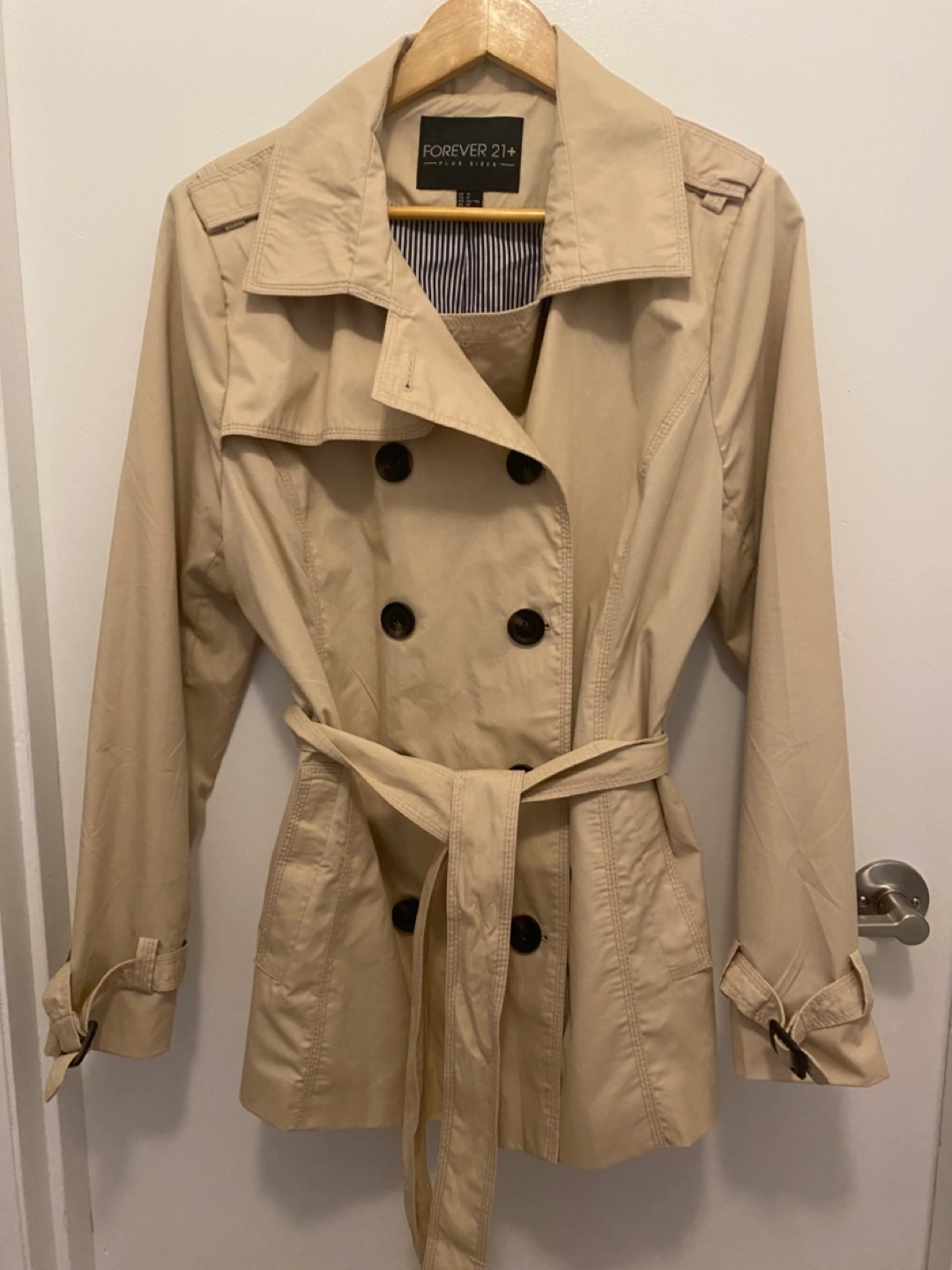 Women's plus size beige trench coat. Double-breasted style. Features a belt. Made in China. 28.75” long with a 25” sleeve length. Button up. Nothing wrong with it, just doesn’t get worn.