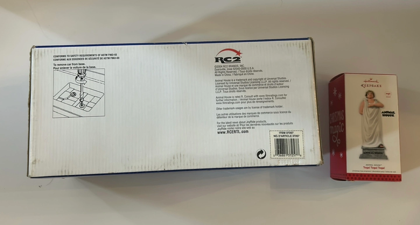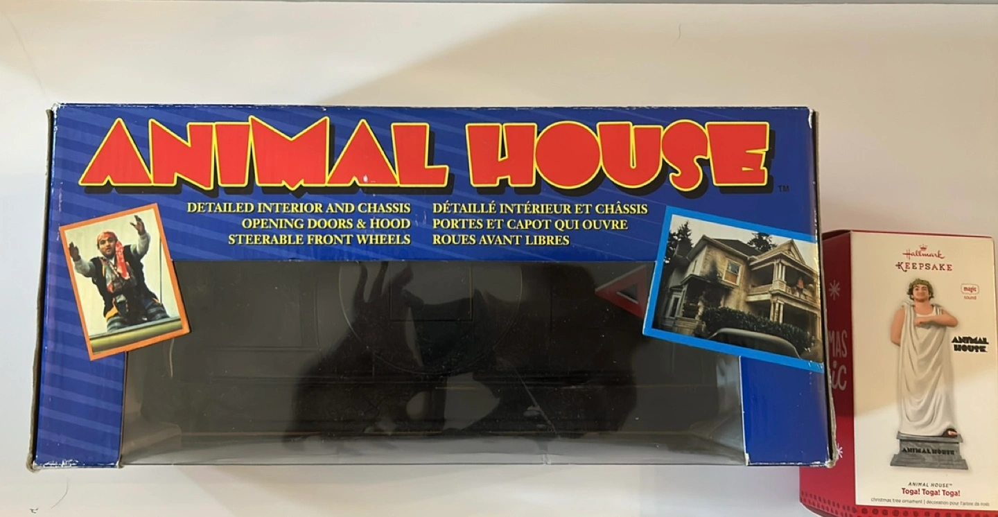 Joy Ride 1:18 scale limited edition die-cast metal Animal House Deathmobile. Features detailed interior and chassis, opening doors and hood, steerable front wheels. Part of the 25th Anniversary Reunion collection. Includes Hallmark Keepsake Ornament of John Belushi in infamous Toga, Toga, Toga scene with is perfectly to scale as the car.