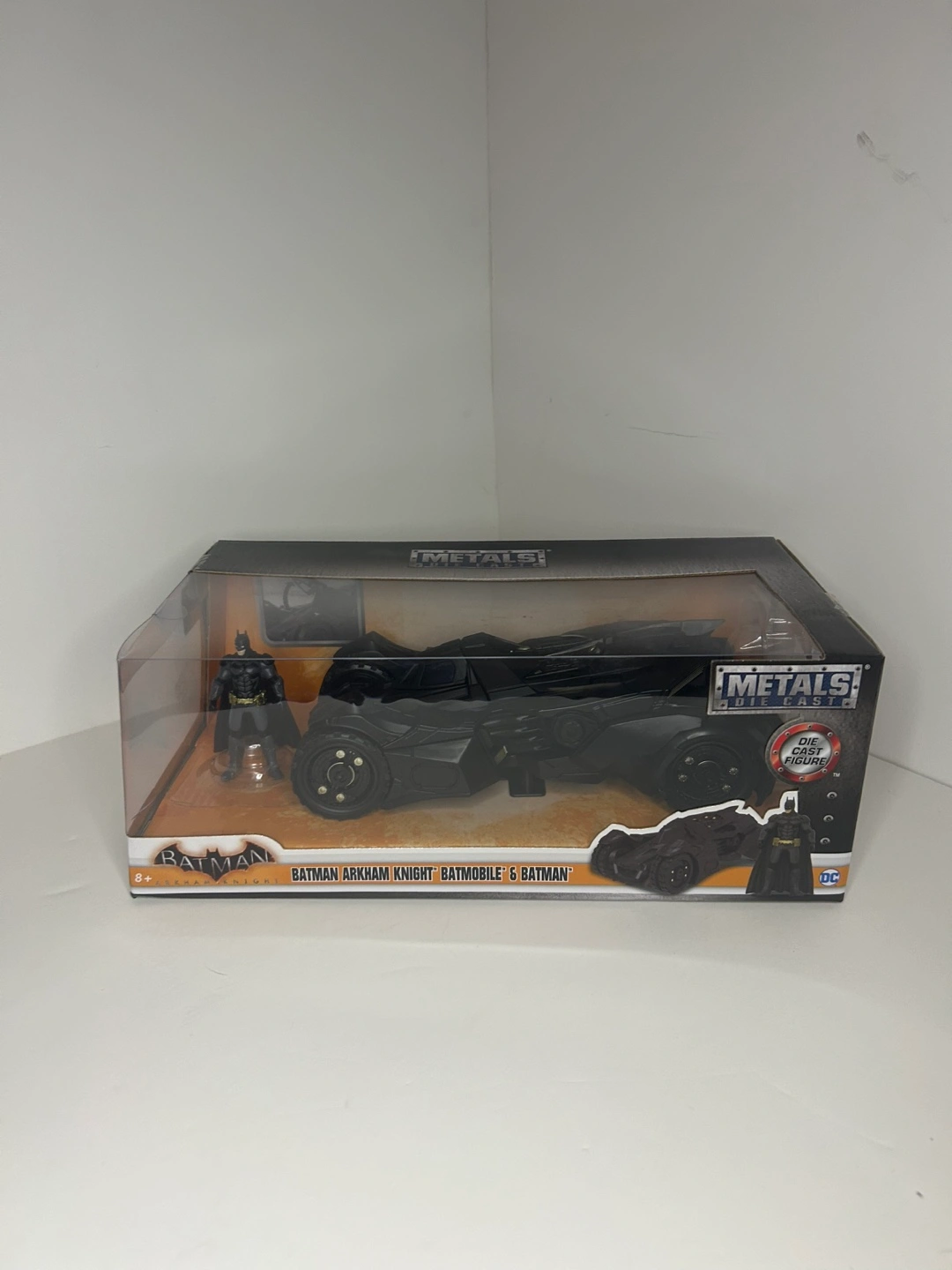 Collectible die-cast Batman Arkham Knight Batmobile and Batman figure. New in box. Part of the Metals Die Cast series. Includes small Batman figure. 1/24 scale.