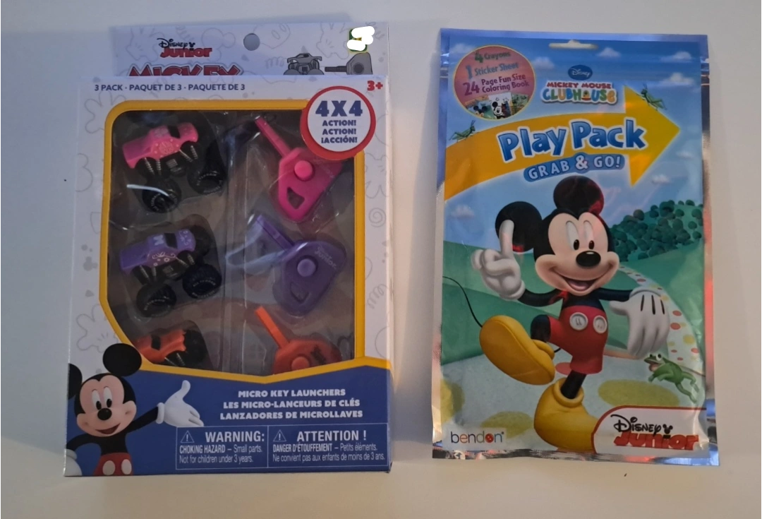 Grab and go Mickey Mouse Clubhouse play pack. Includes 3-pack of micro key launchers and a 24-page fun-size colouring book with crayons. For ages 3+. New and unopened.