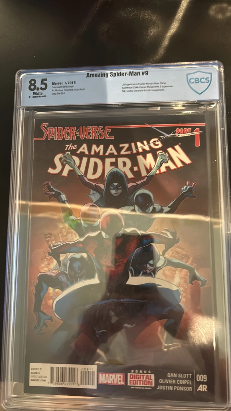 Amazing Spider-Man #9 comic book, graded 8.5 by CGC. Part 1 of Spider-Verse. January 2015. Olivier Coipel cover & art. Dan Slott story.