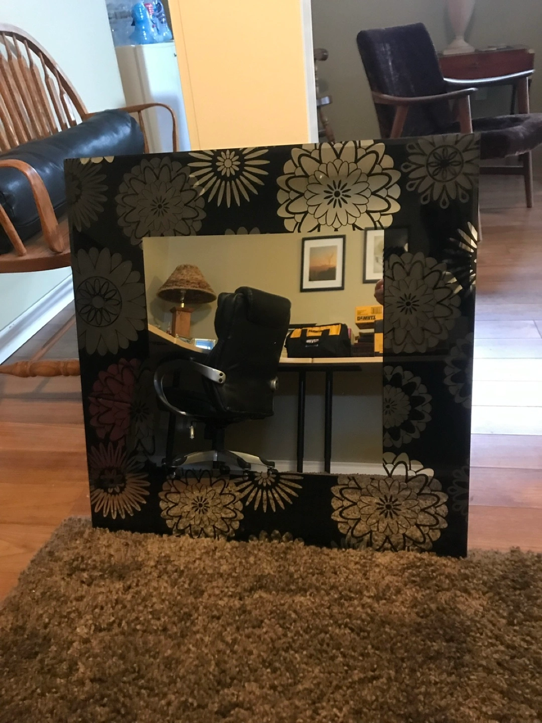 Large rectangular mirror. Black frame with grey floral design. Perfect for any room. Excellent condition.