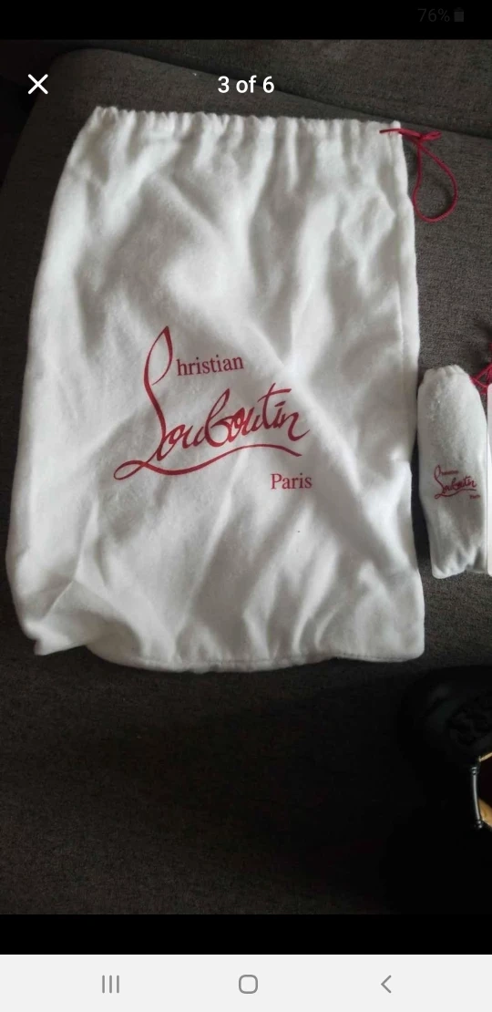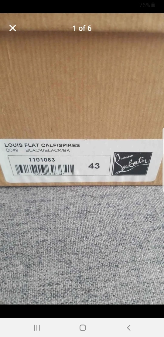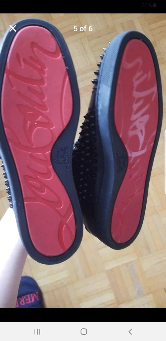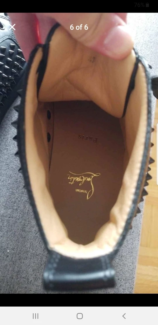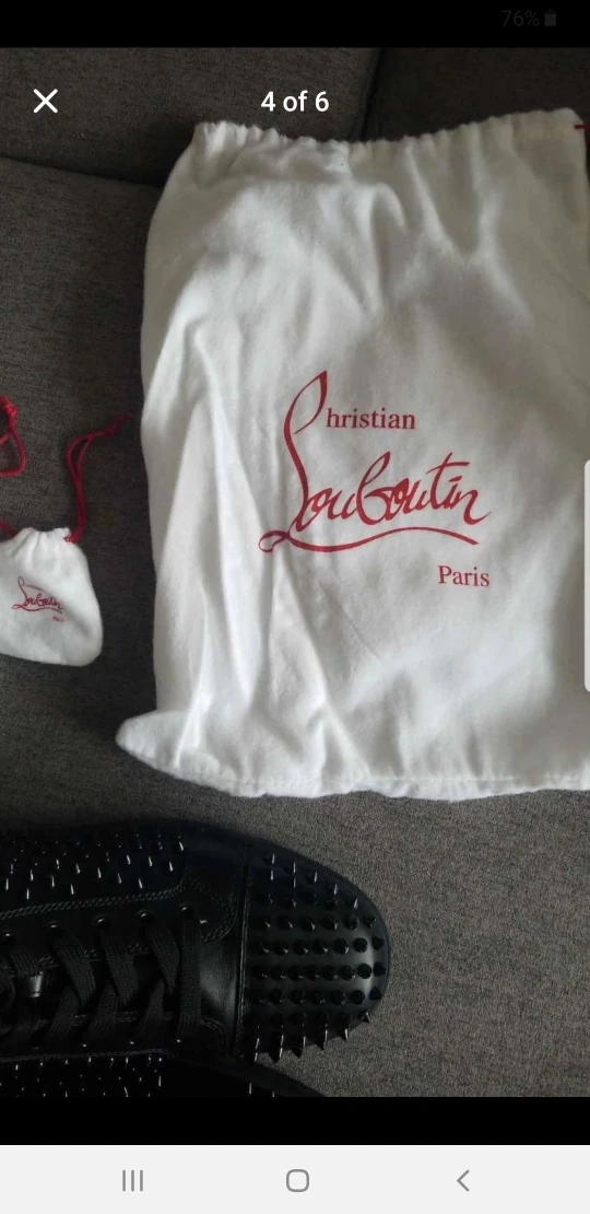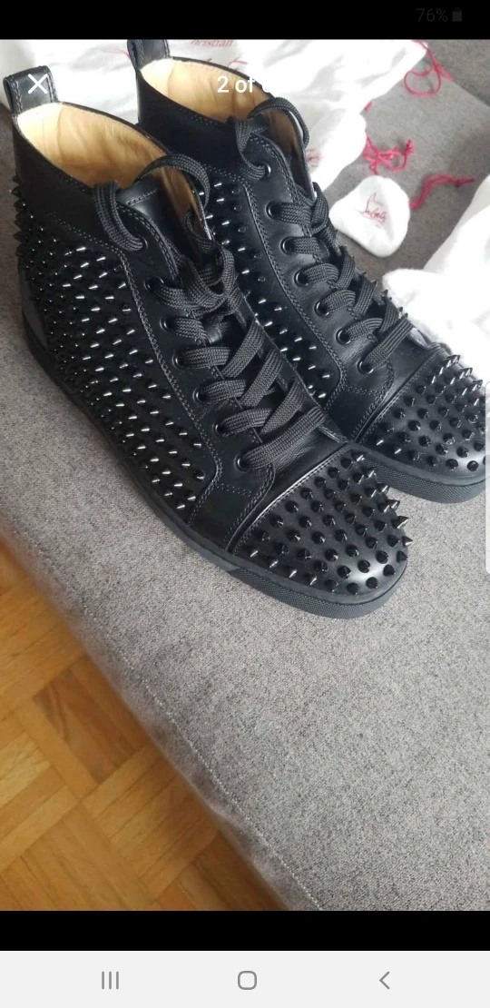78Men's black leather high-top sneakers. Spike detailing. Red soles. Includes dust bag and shoebox. Size 43.