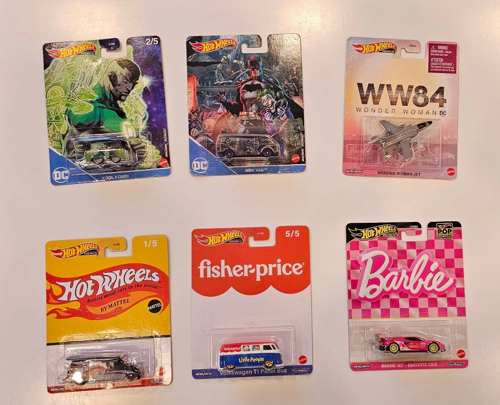 Six Hot Wheels cars in individual packaging. Includes DC Comics, Wonder Woman, and Fisher-Price themed vehicles. One Barbie Corvette. Collectible die-cast cars. New in package.