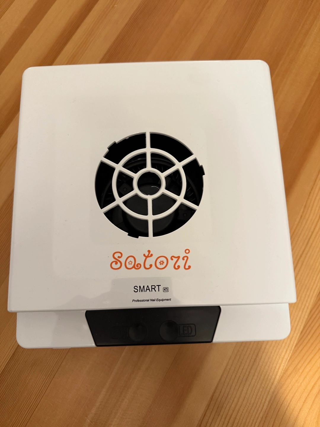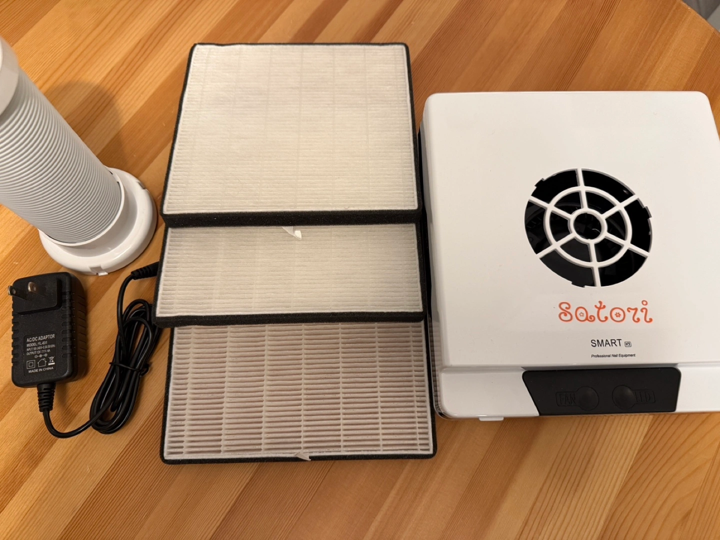 Nail dust collector. White with black accents. Includes three extra filters and a power adapter. Professional nail equipment.