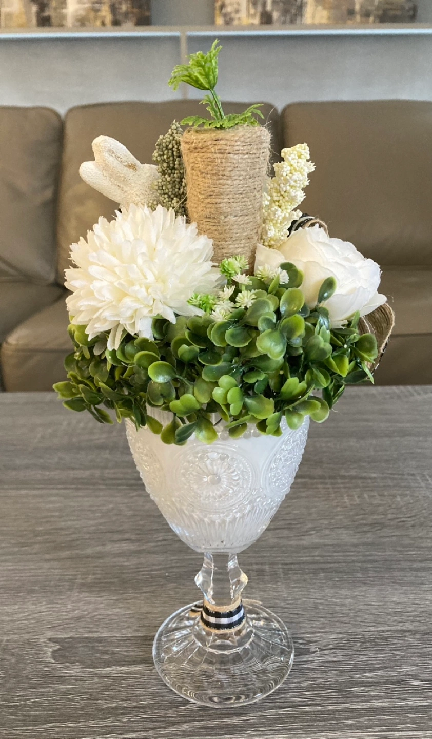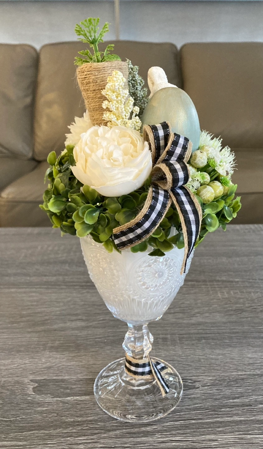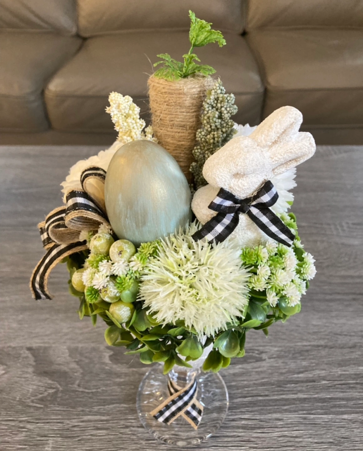 Spring/Easter Glass Egg Vase with Bunny Arrangement Approx. 10.5” tall by 5” diameter Glass egg shaped vase on stand holds artificial flowers, berries, greenery, egg, twine carrot, bunny and burlap/ plaid ribbon. Please follow the link below for more. Thanks. Facebook page: Artizanna https://www.facebook.com/profile.php?id=100073692274142 Or Instagram: @artizanna__