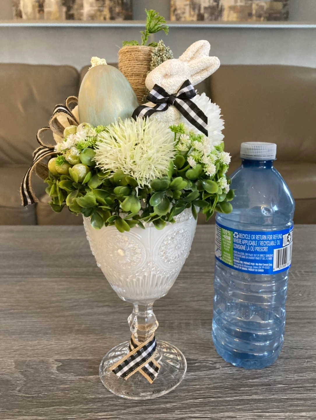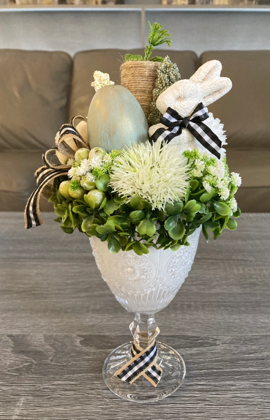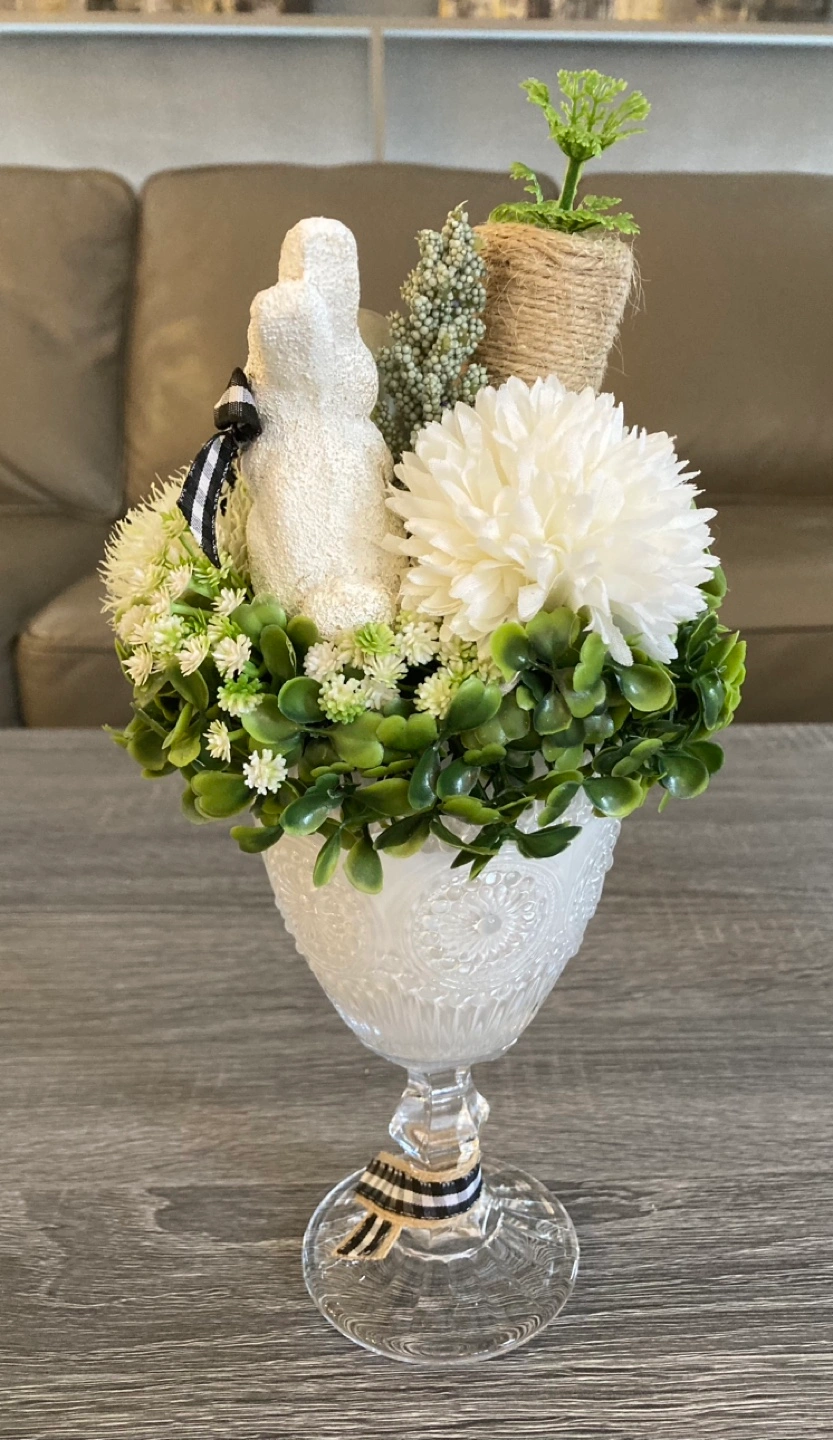 Spring/Easter Glass Egg Vase with Bunny Arrangement Approx. 10.5” tall by 5” diameter Glass egg shaped vase on stand holds artificial flowers, berries, greenery, egg, twine carrot, bunny and burlap/ plaid ribbon. Please follow the link below for more. Thanks. Facebook page: Artizanna https://www.facebook.com/profile.php?id=100073692274142 Or Instagram: @artizanna__