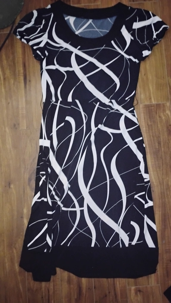 Short sleeve summer dress. Features a black and white abstract print. Round neckline. Knee-length.
