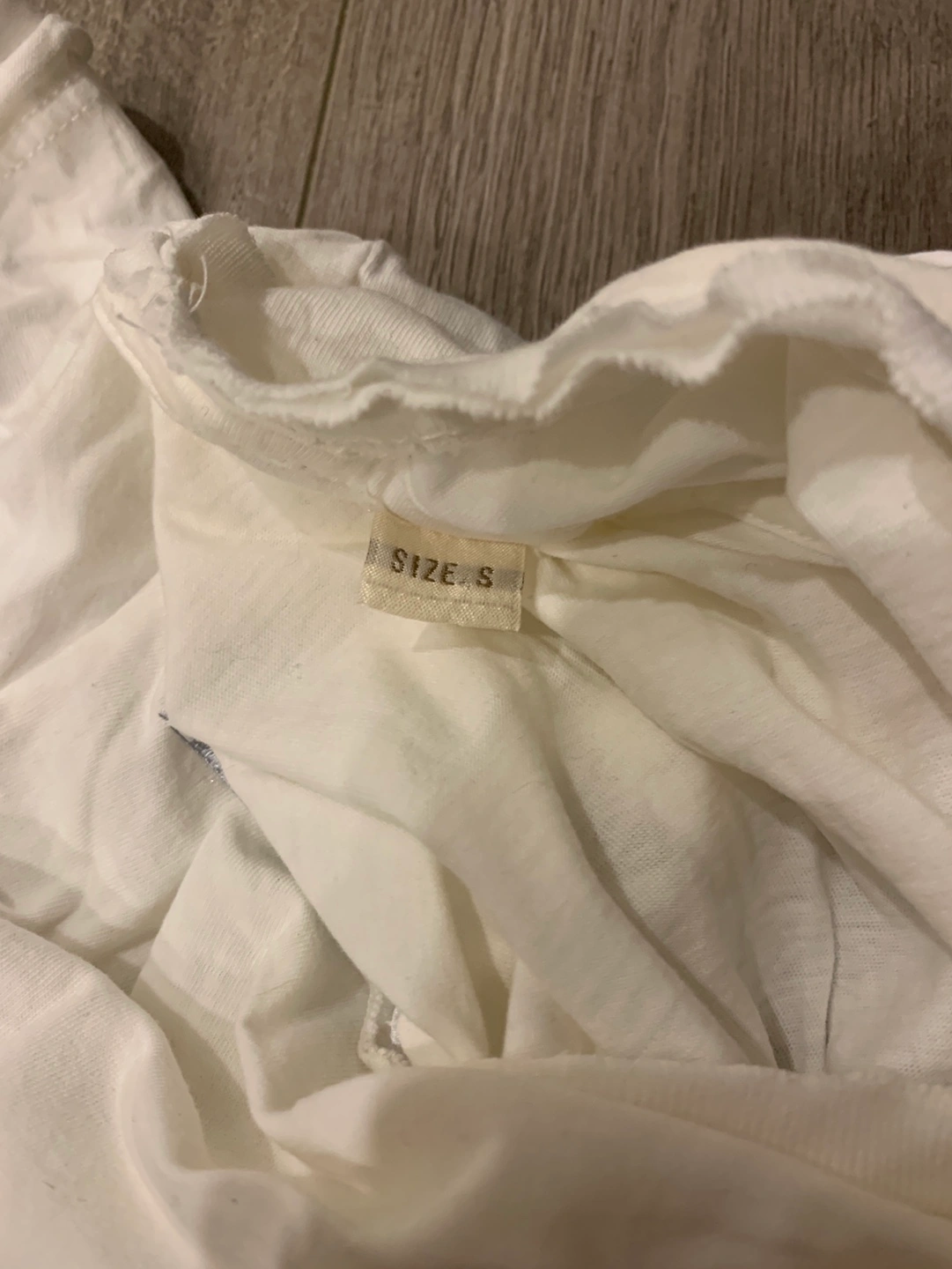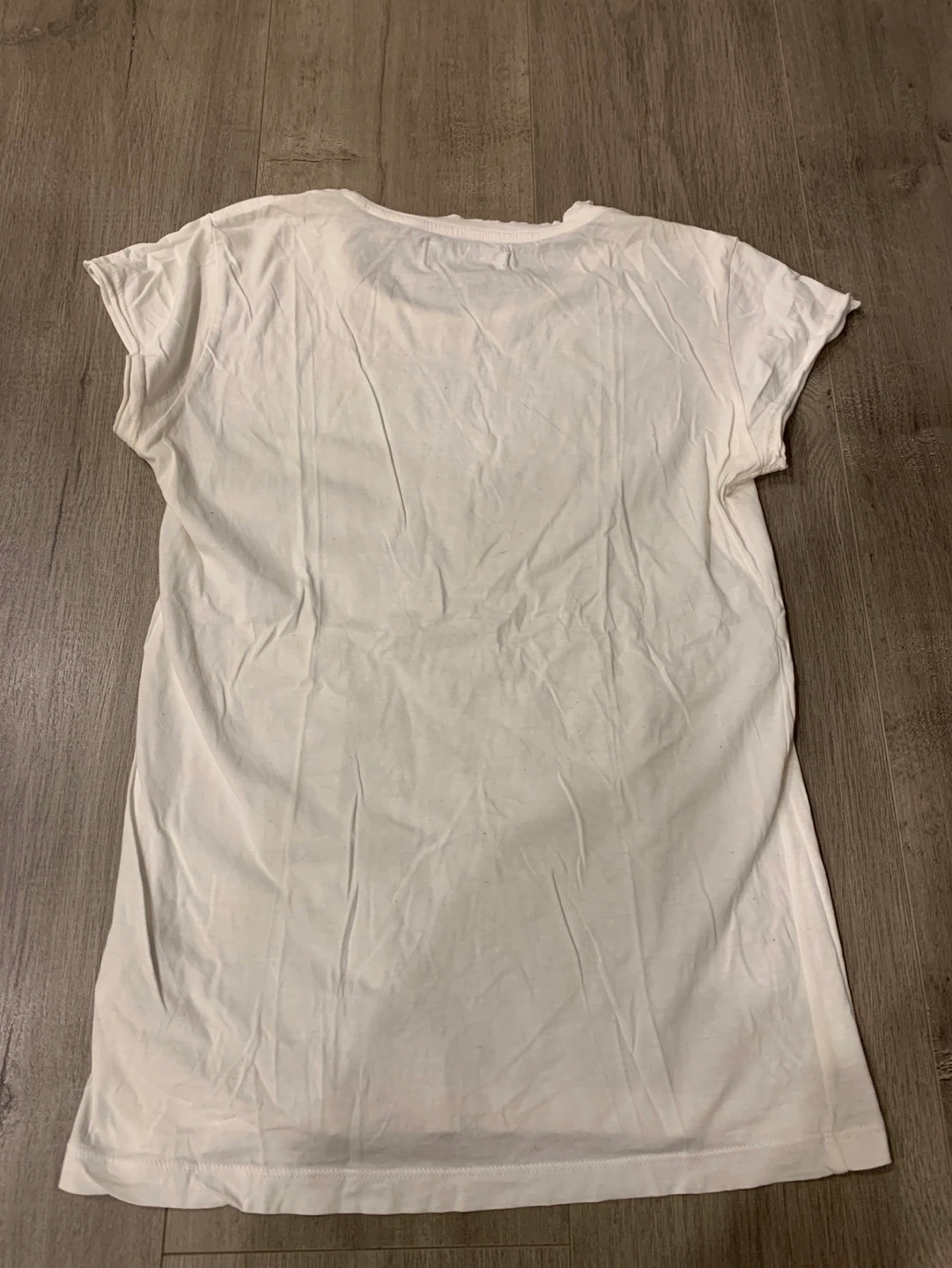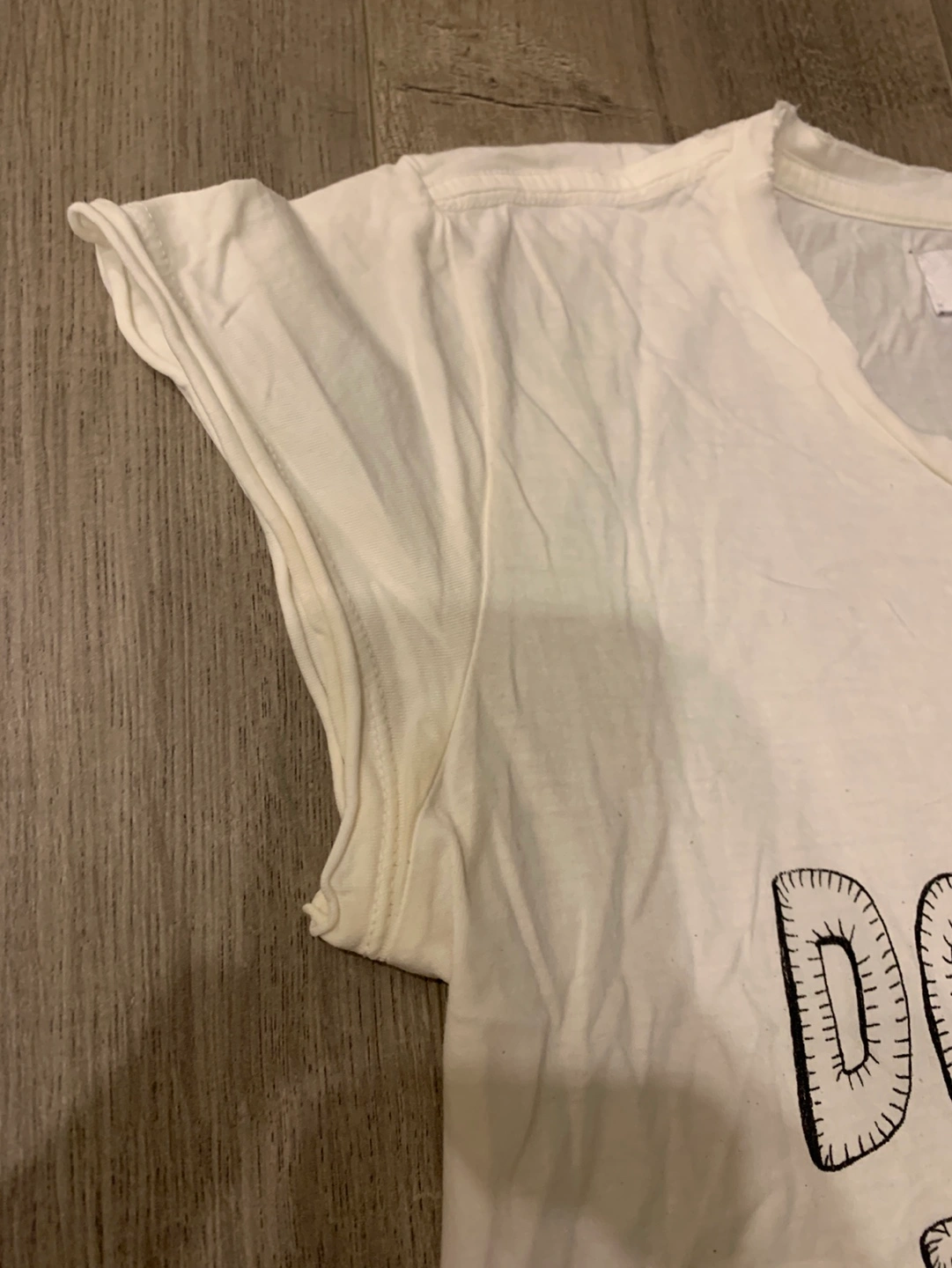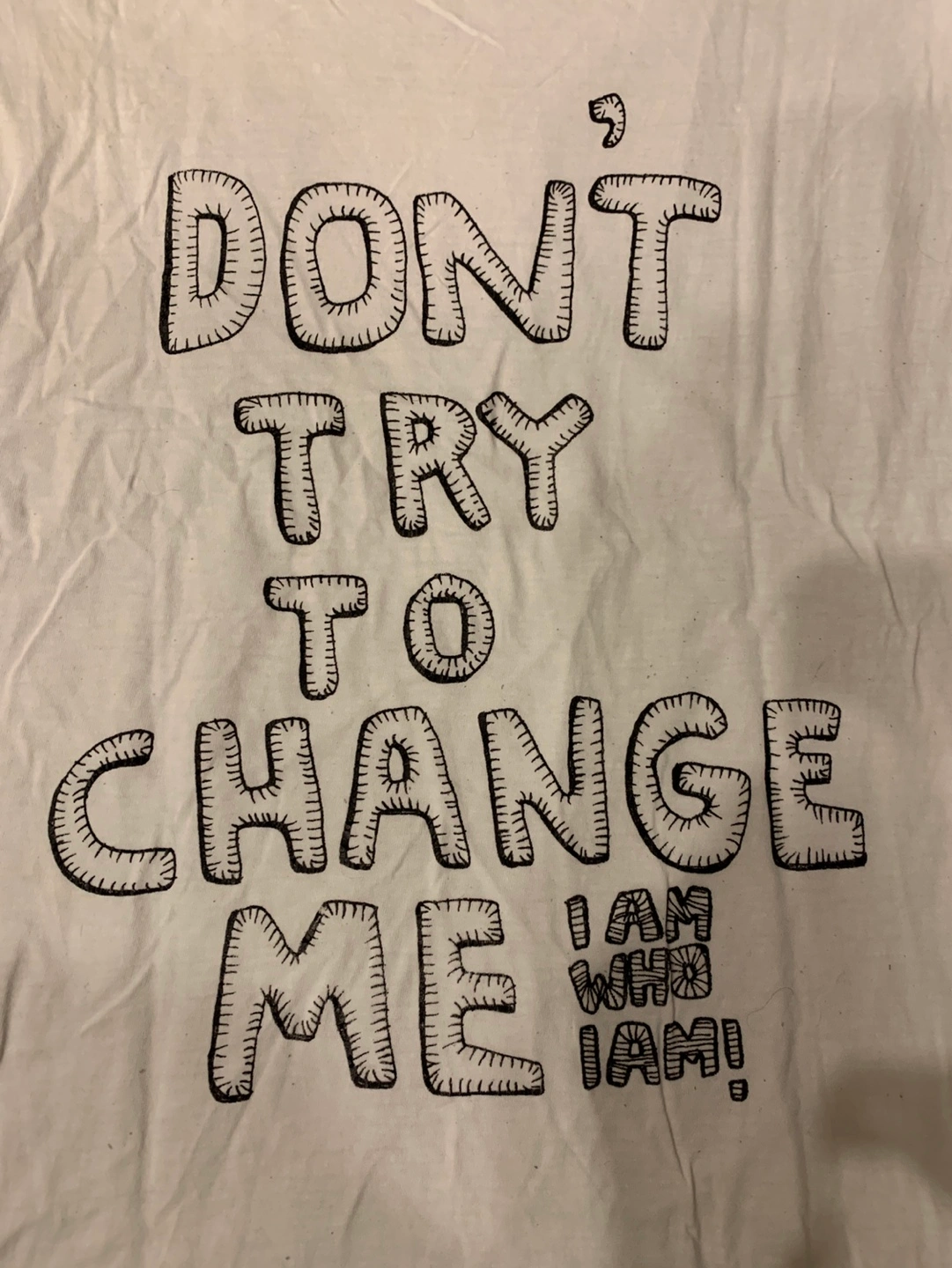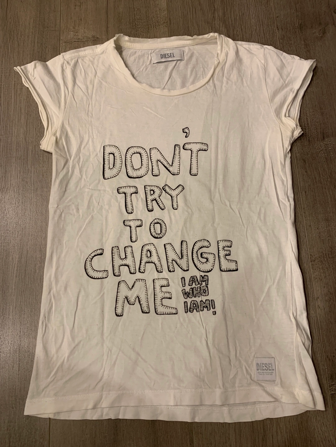 Vintage -white cotton t-shirt. Features a graphic print with the text "Don't try to change me. I am who I am!" Short sleeves, slight V-neck. Size S.