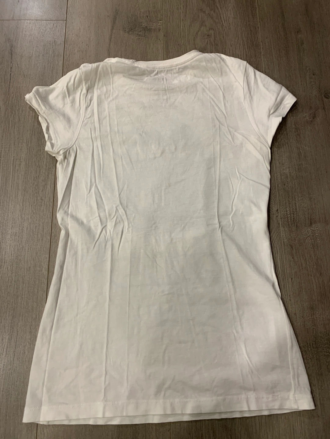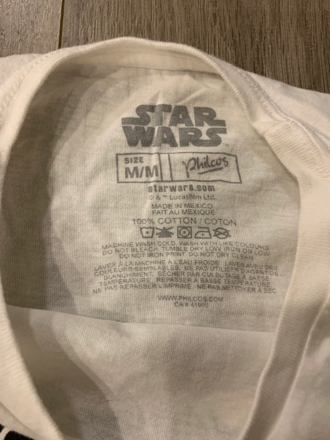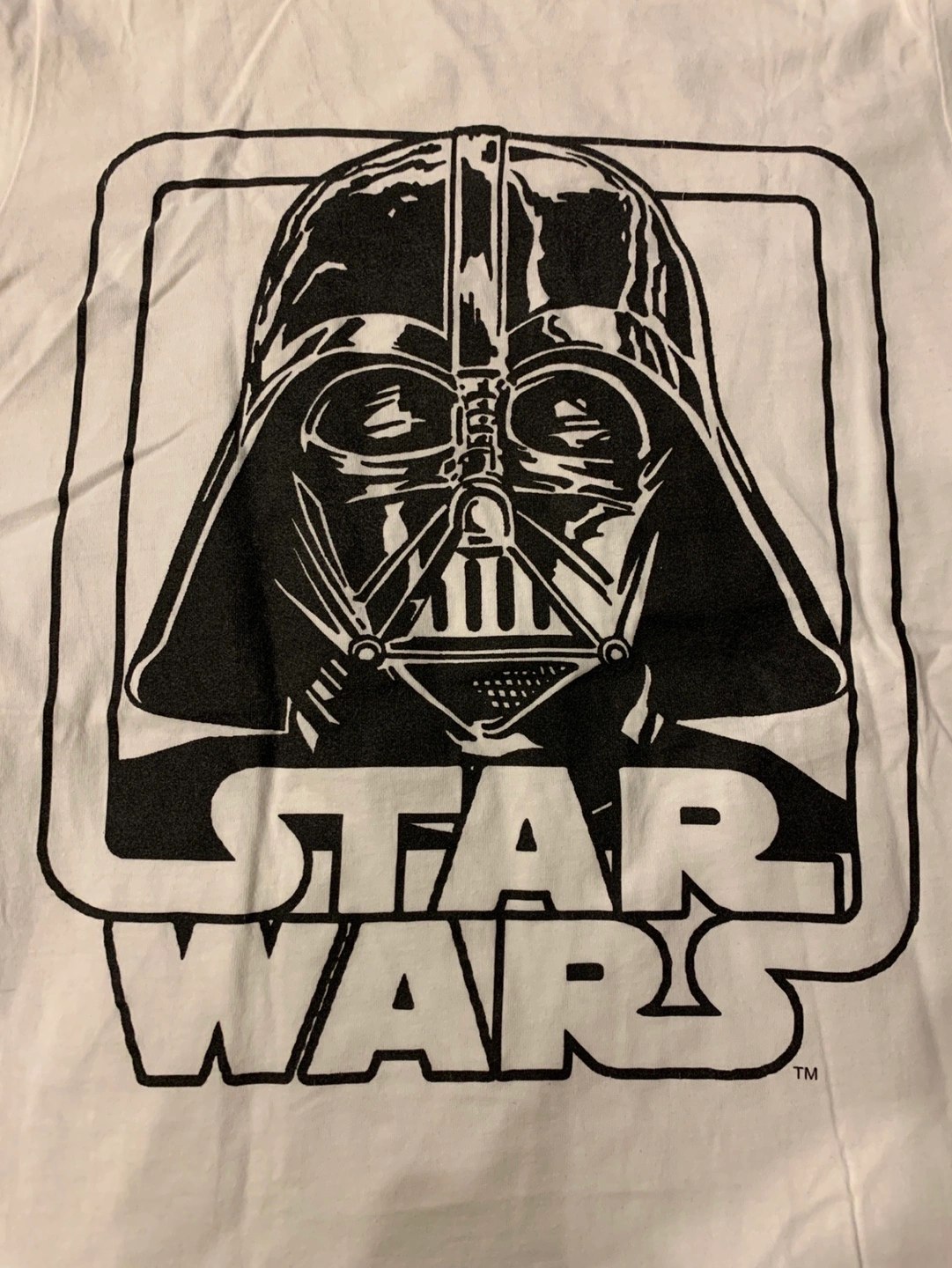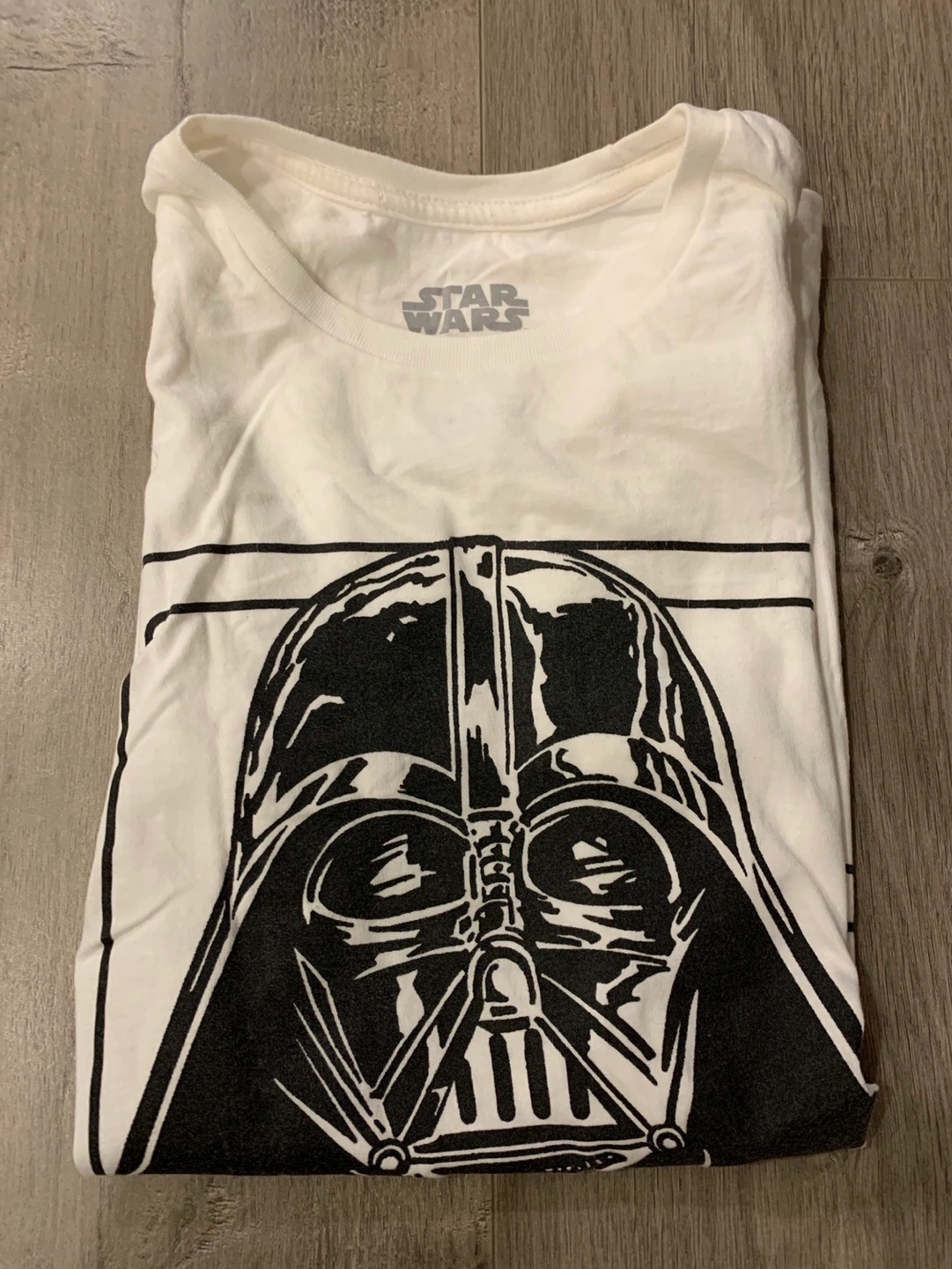 White t-shirt. Features a black and white graphic of Darth Vader's helmet. Star Wars Original. 100% cotton. Machine wash cold. Slim fit women medium/ small fit.