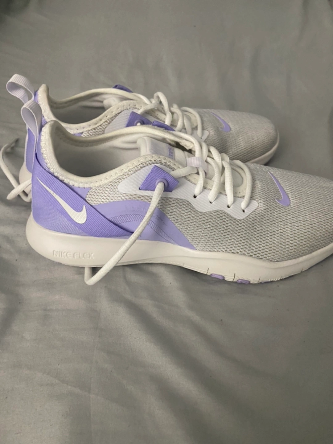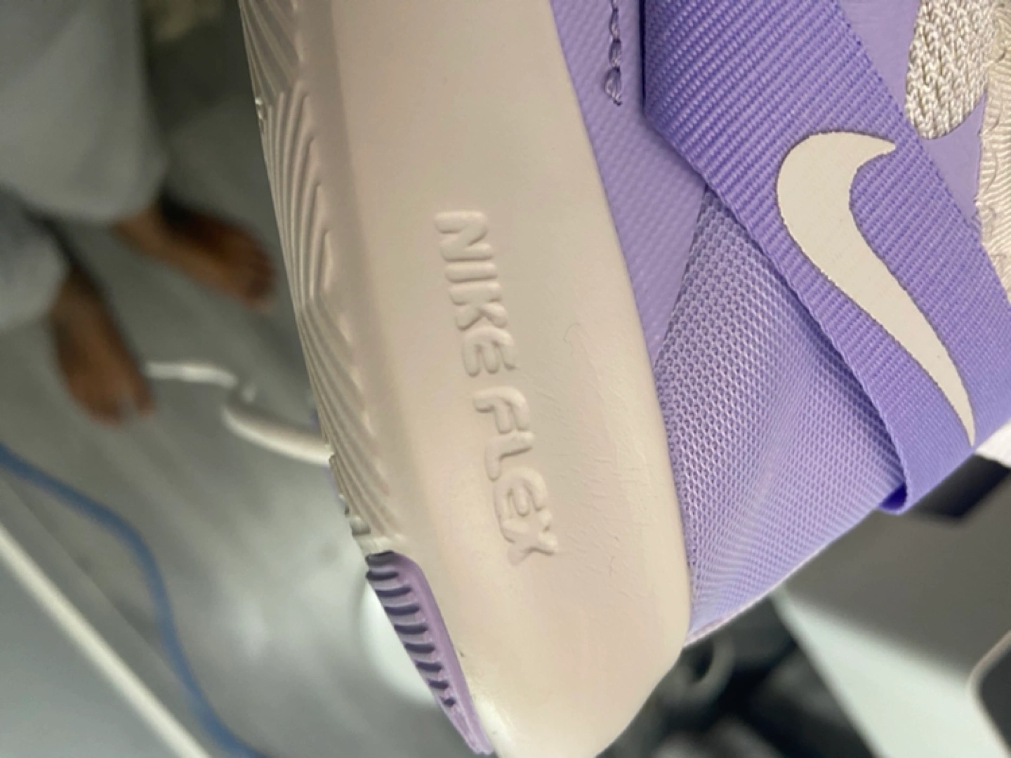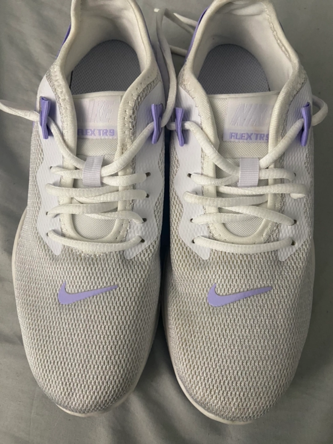 Women's Nike Flex TR 9 running shoes. Purple and white colourway. Lightweight and breathable design. Great for workouts or casual wear.