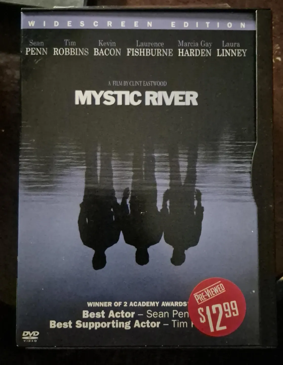 Selling a used DVD of Mystic River, a film by Clint Eastwood. This is the widescreen edition. The cover shows Sean Penn, Tim Robbins, Kevin Bacon, Laurence Fishburne, Marcia Gay Harden, and Laura Linney. The DVD includes a scene index on the back cover. It was originally priced at $12.99.