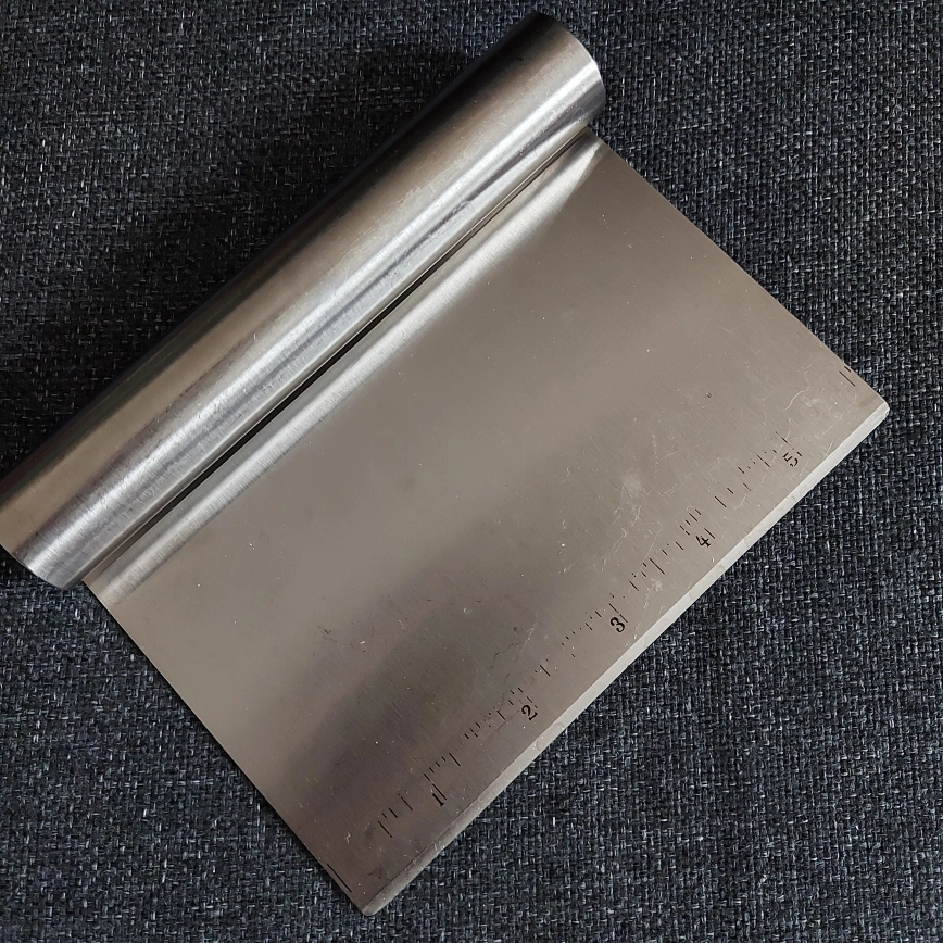 1000+Stainless steel bench scraper. Measurements etched on the blade but faded. Rolled handle for comfortable grip. Used condition. Free with other purchase or trade. Otherwise $1 cash. Pick up at Pape Station.