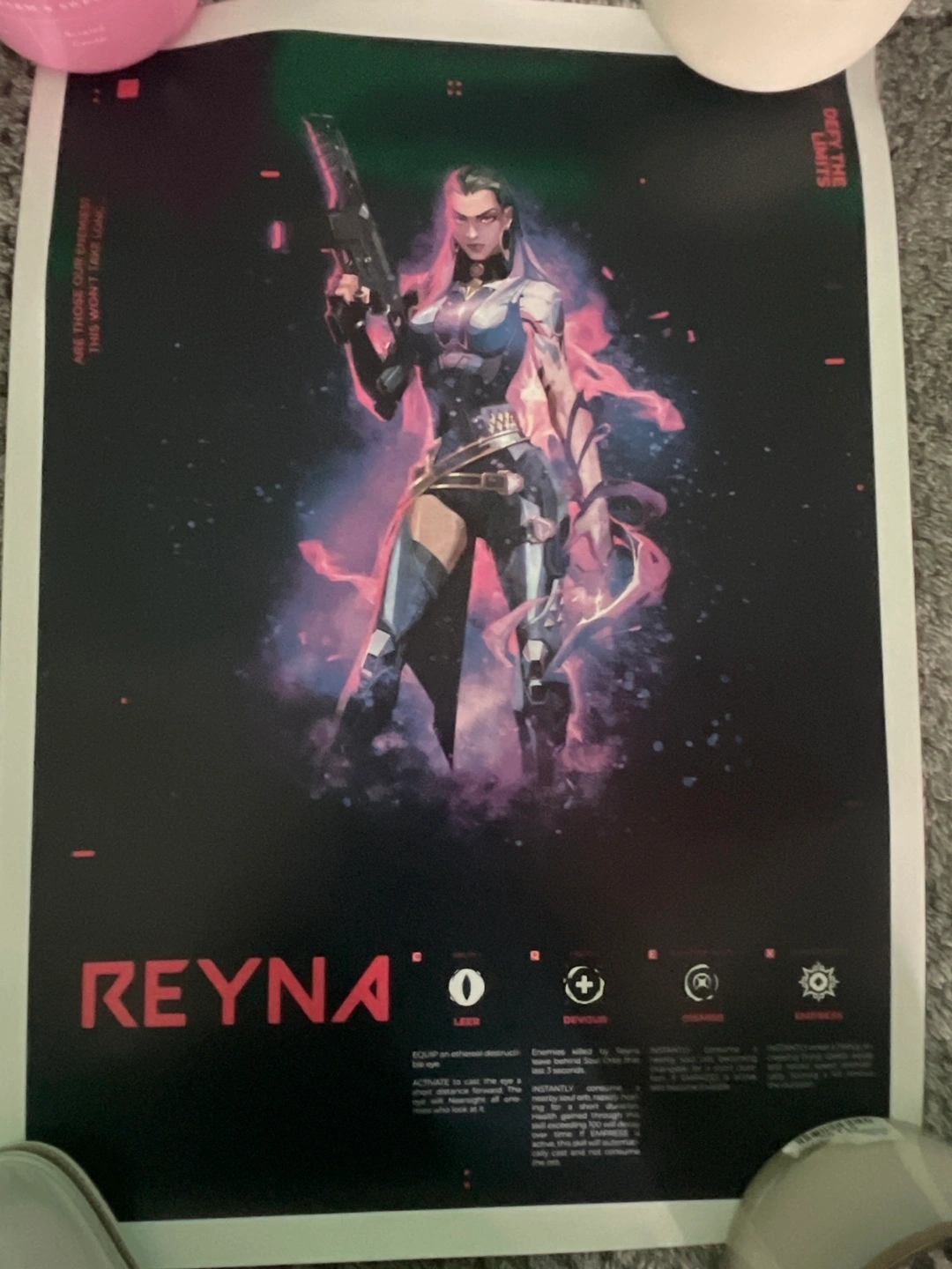 Large format poster featuring Valorant agent Reyna. High-quality print, dark background. Includes character details and abilities.