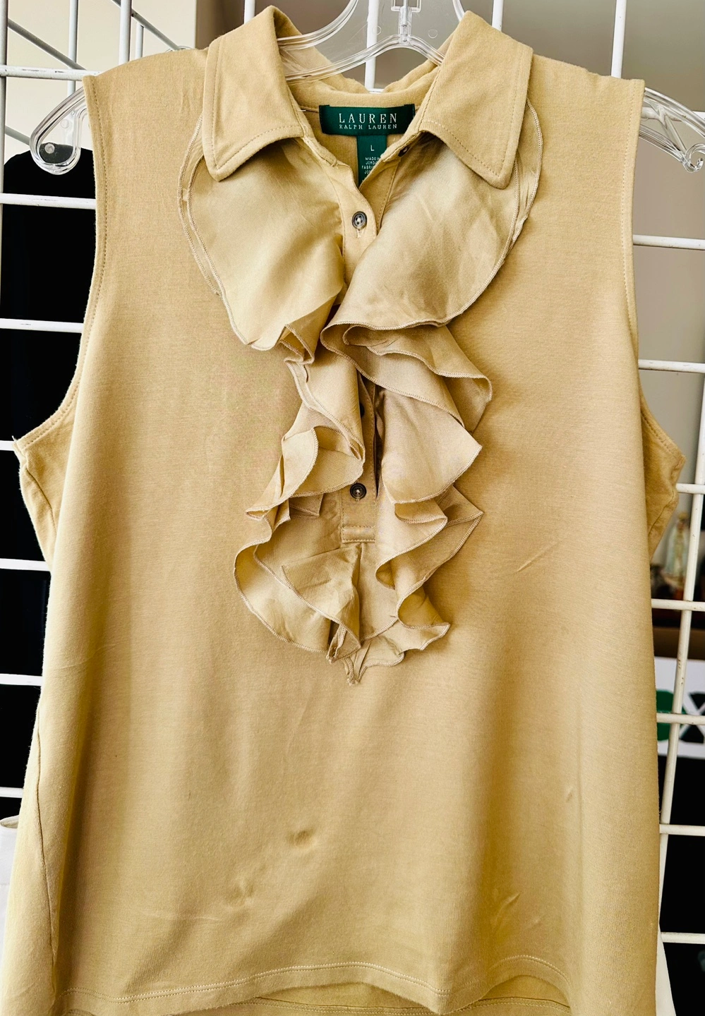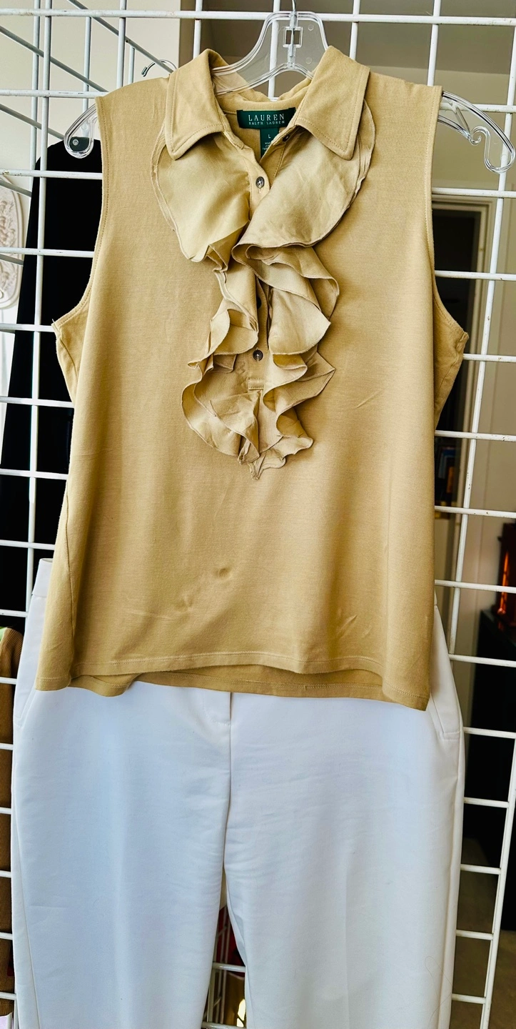 Khaki sleeveless collared blouse. Features a ruffled detail at the front. Size large. Made in Jordan.