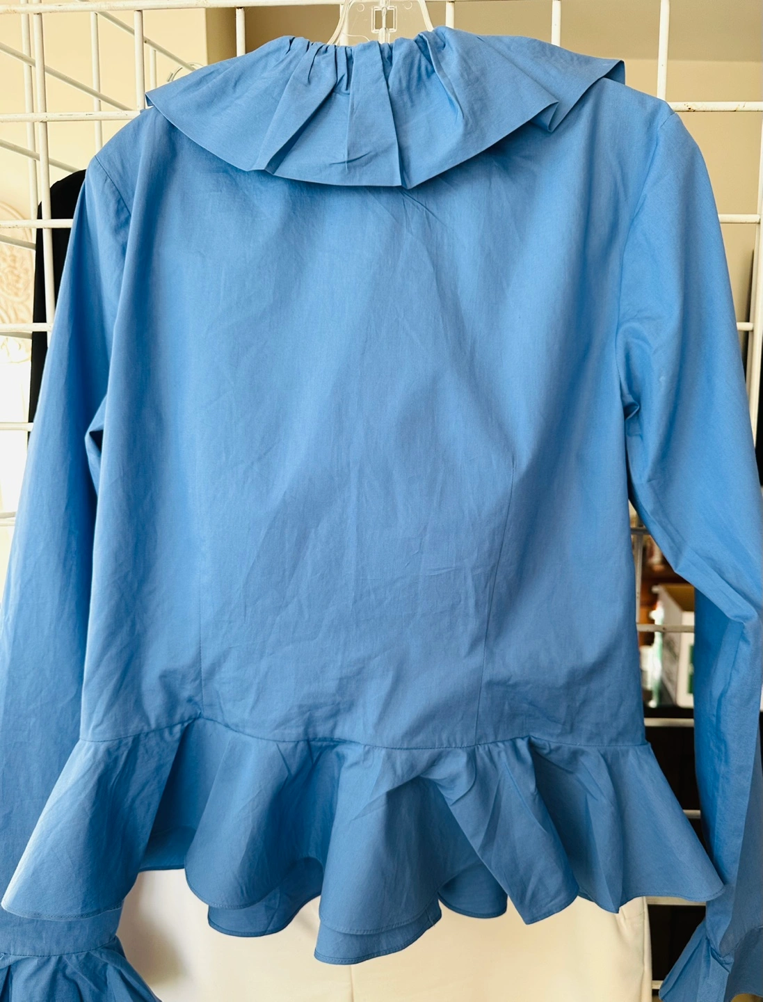 Beautiful blue blouse. Features long sleeves, ruffled neckline and hem. Size 12. 100% cotton. New with tags.
