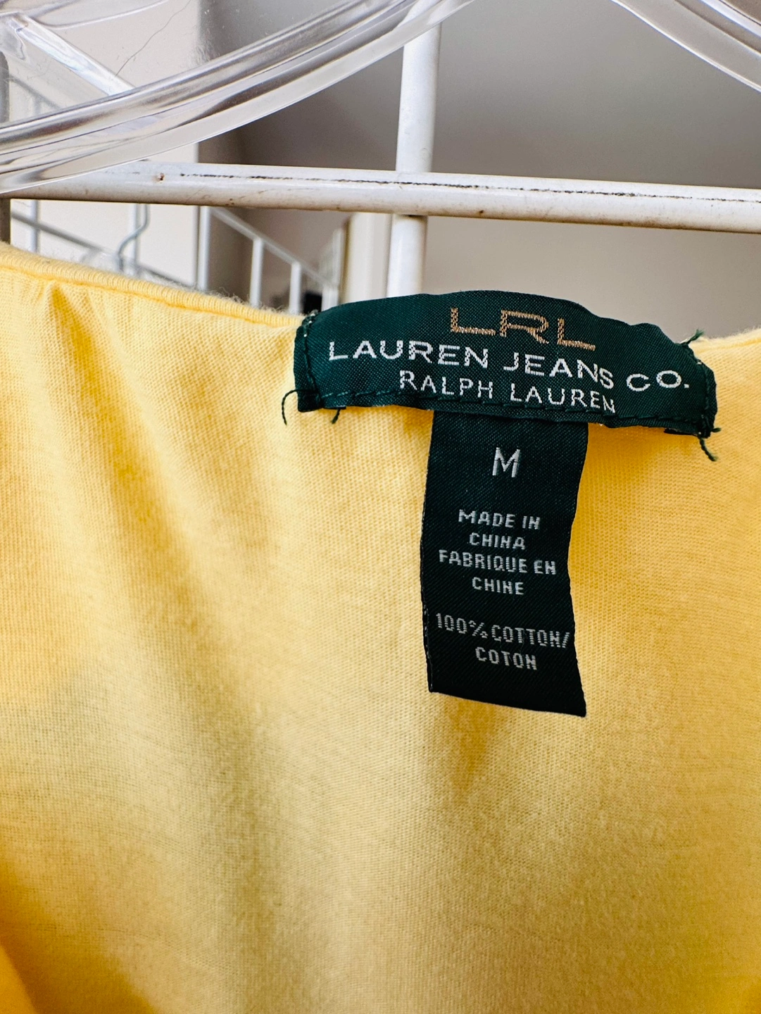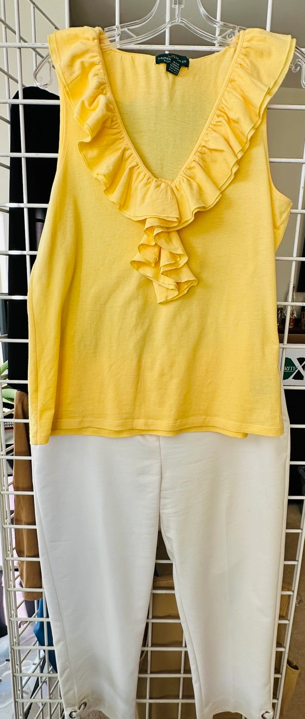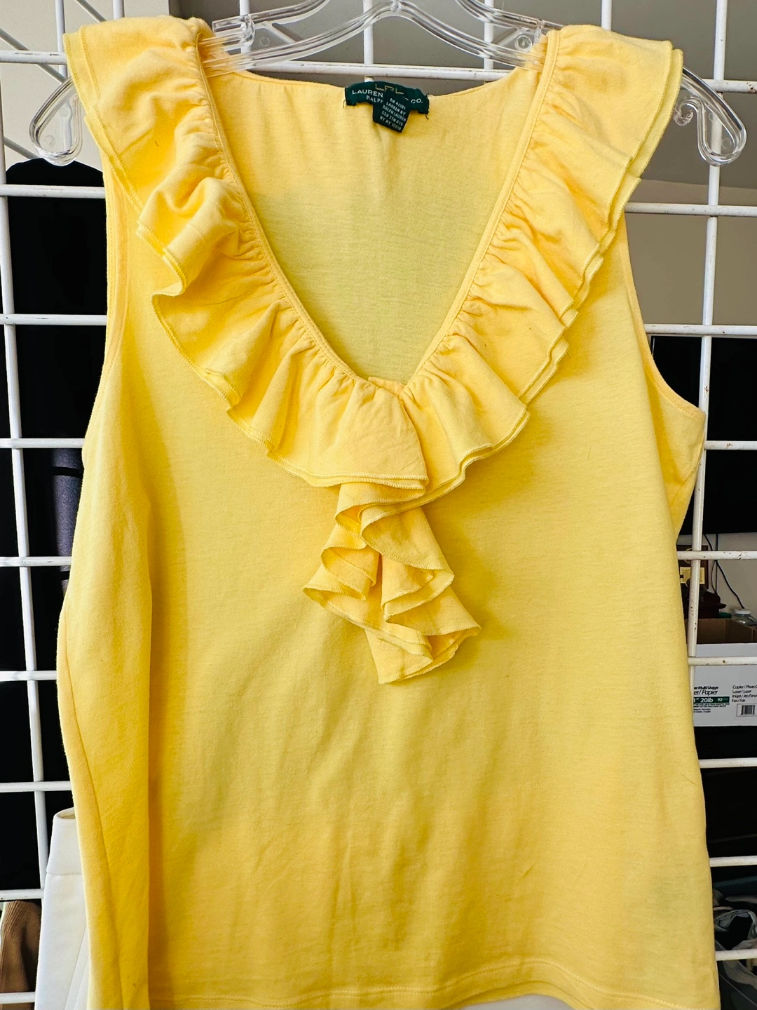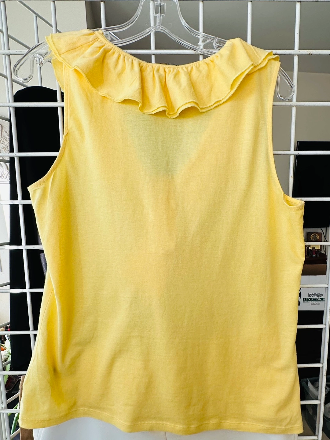 Women's medium yellow sleeveless cotton top. Features a ruffled neckline.
