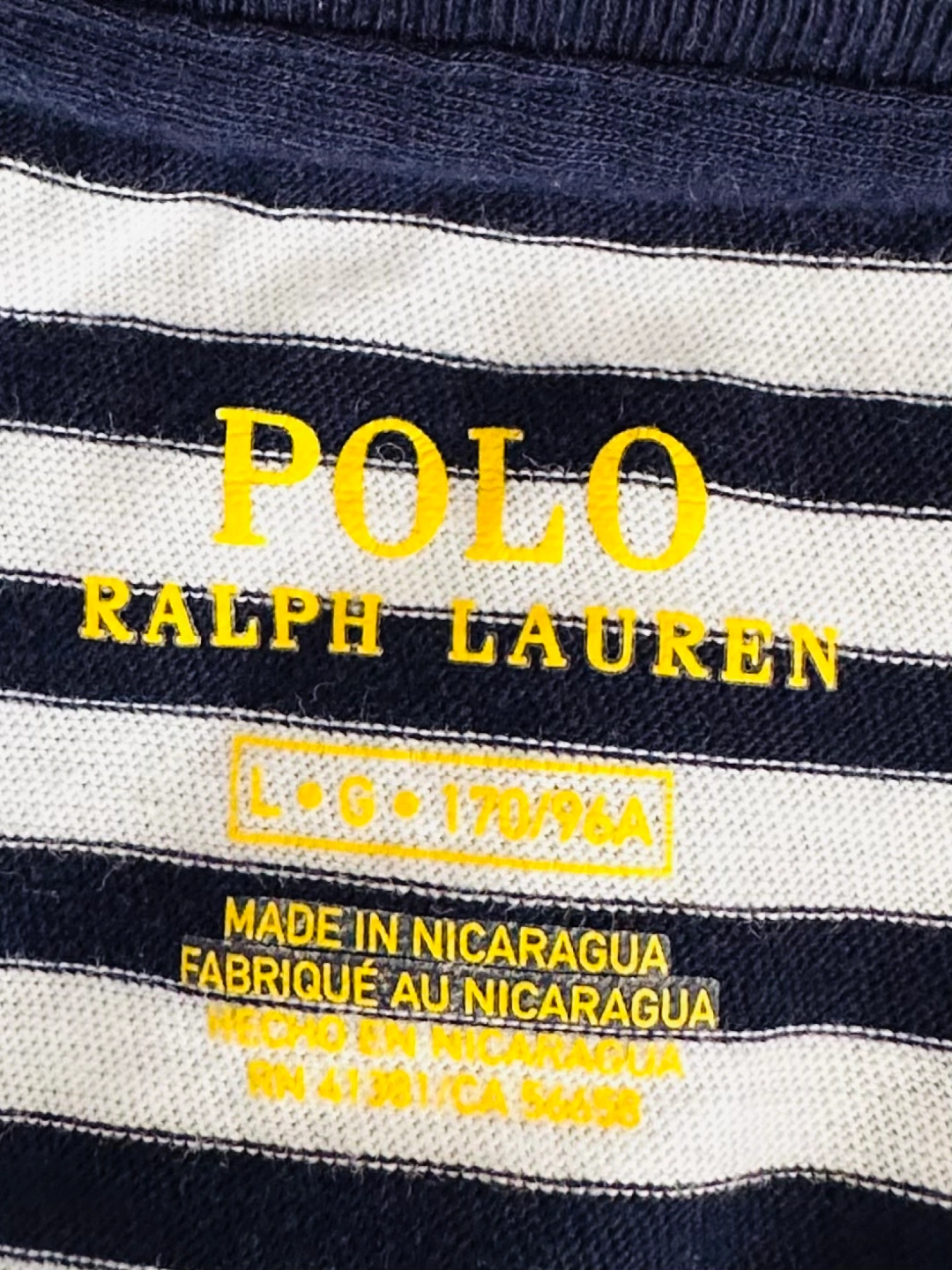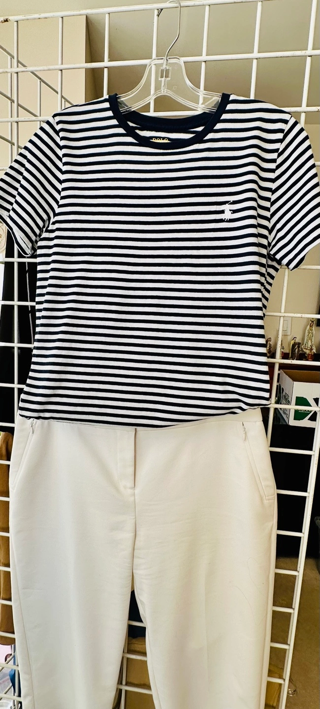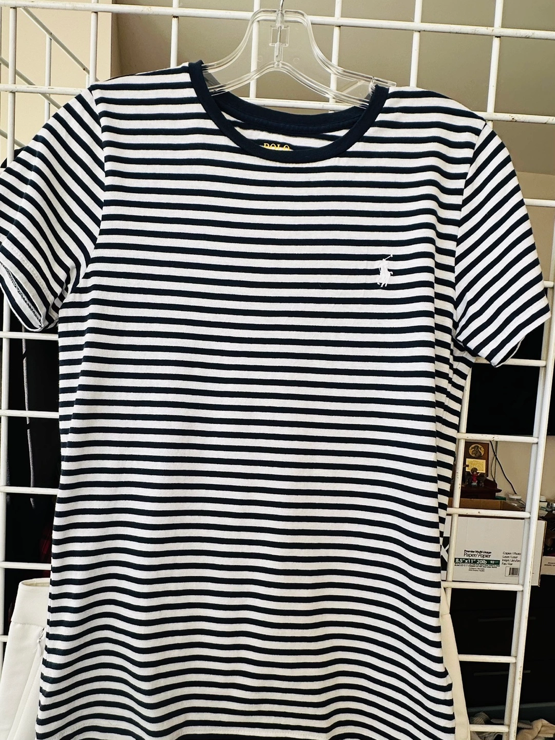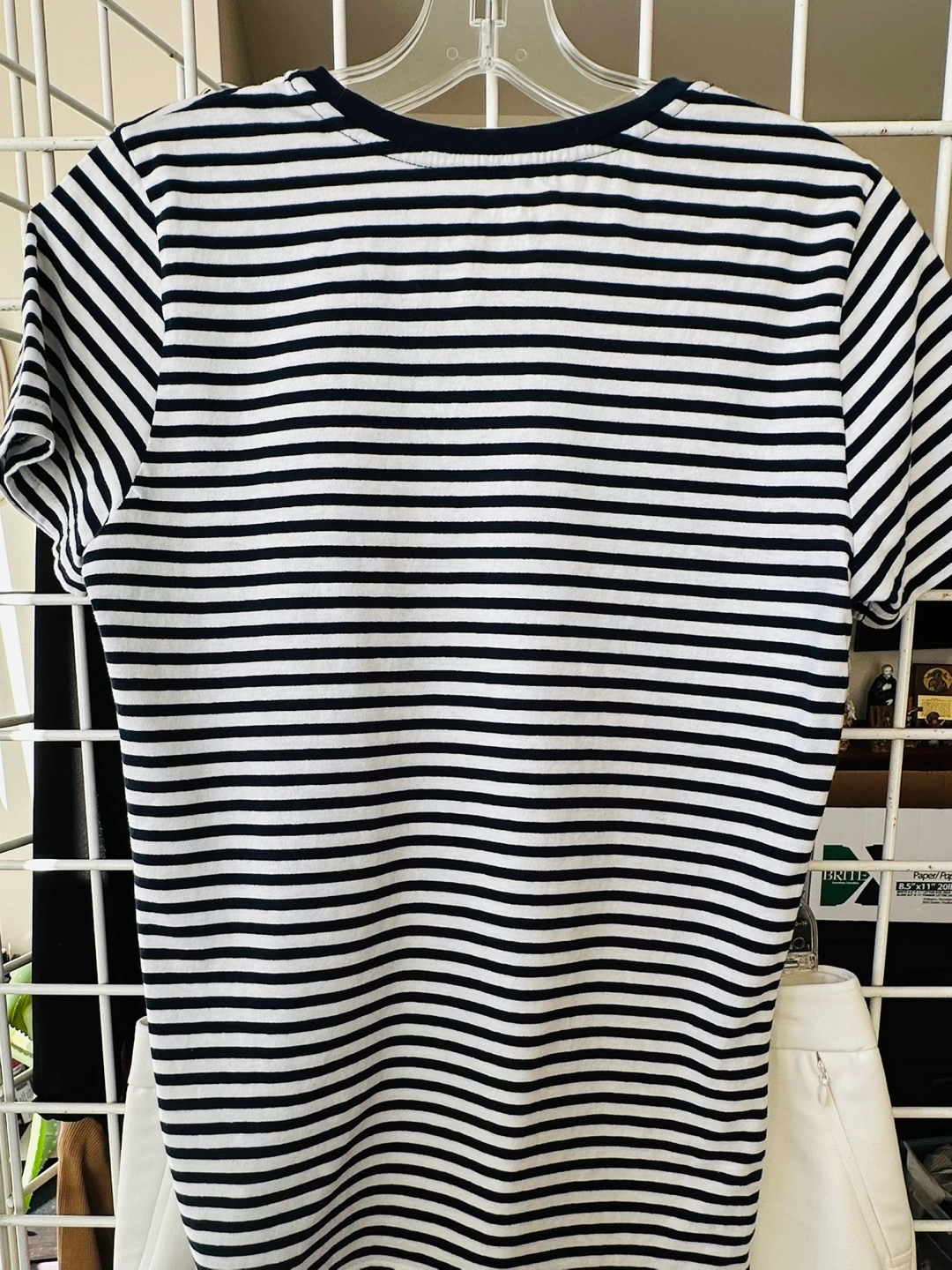 Women's short sleeve, navy and white striped t-shirt. Size large. Made in Nicaragua. Classic style.