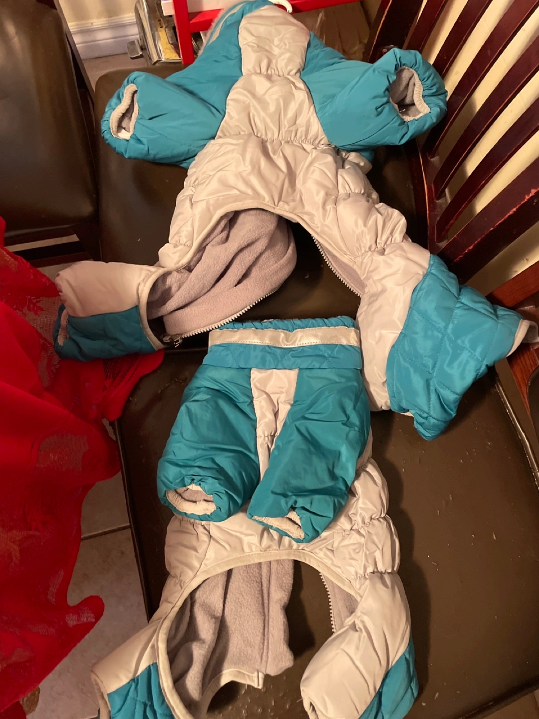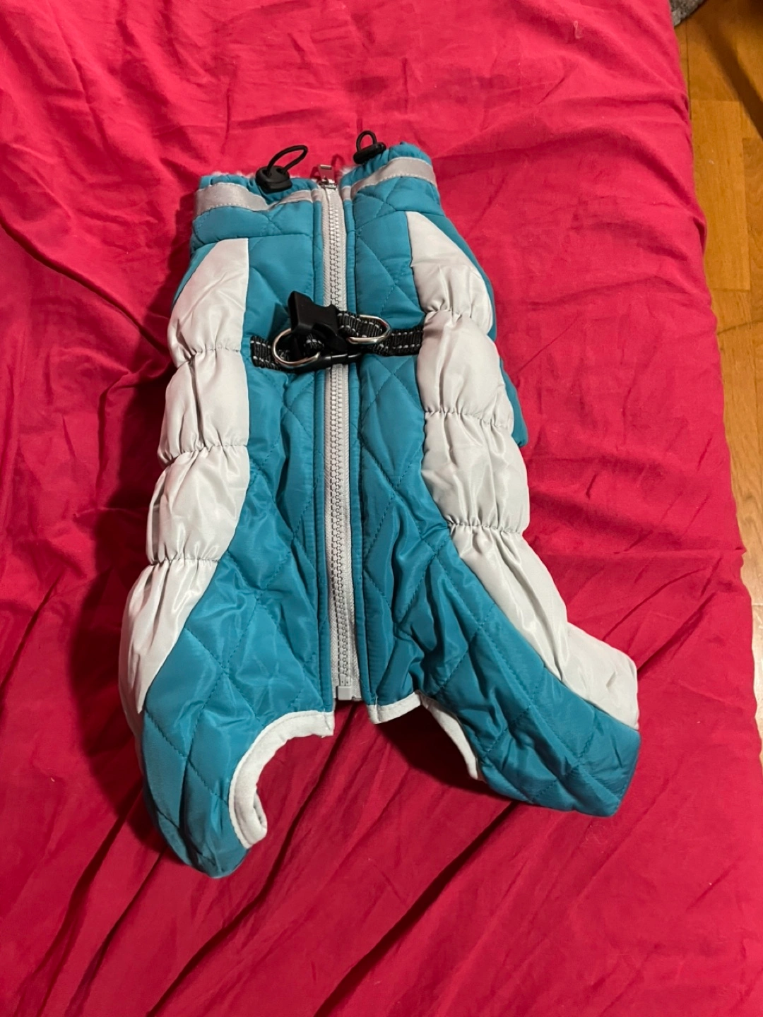 240All (3) Dog-Wear clothes — $20 each or $50 for all 3. {1} Teal & Grey Jacket(S) {2} Teal & Grey Jacket (L) {3} Blue w/ Red Trim clothing Two dog clothes. One blue shirt with red trim. One teal and grey winter coat. Small & Large size. Excellent Condition — Brand New