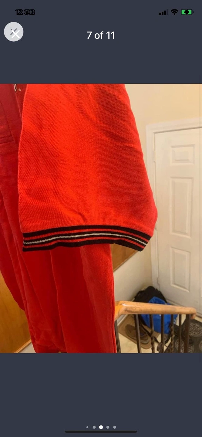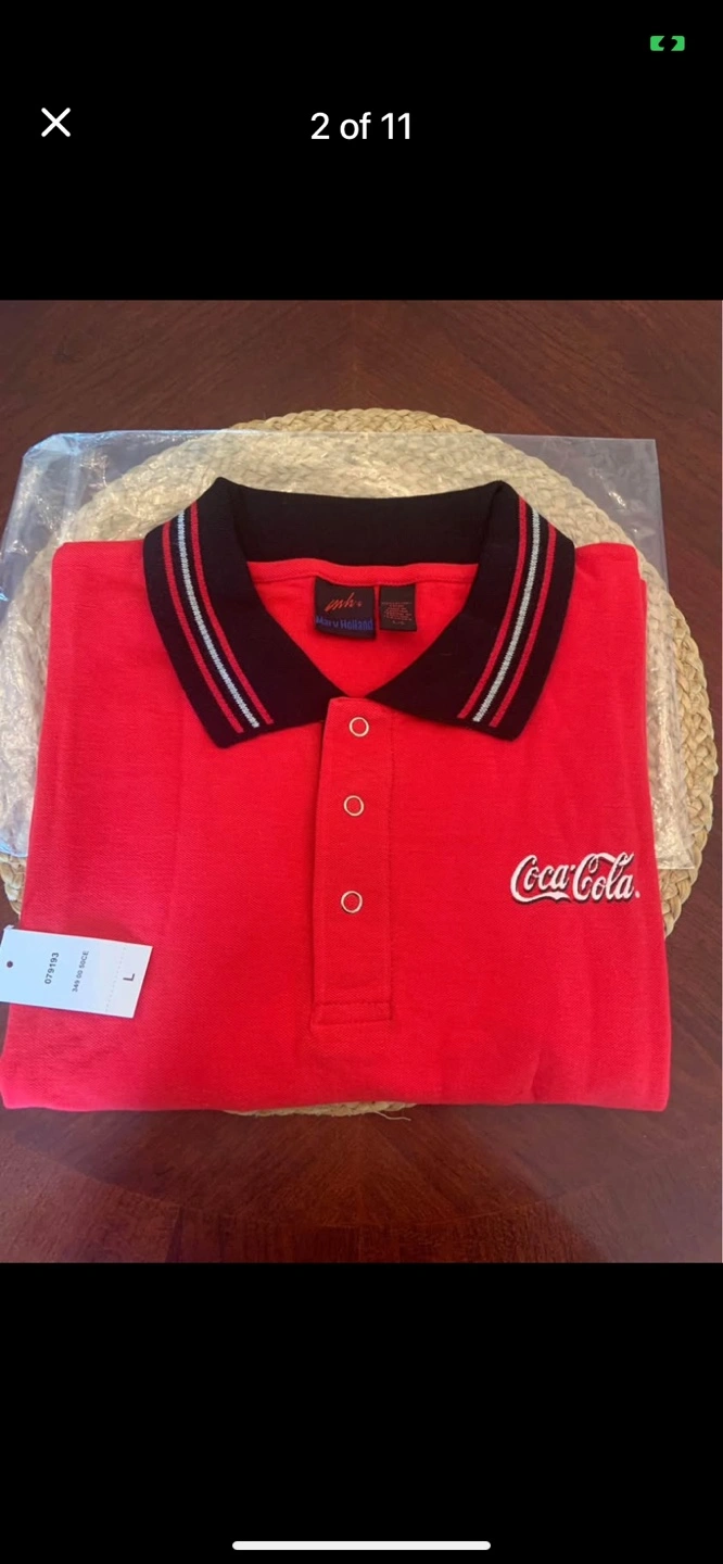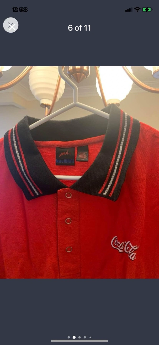 Men's large red Coca-Cola polo shirt. Black and white striped collar. Embroidered Coca-Cola logo. Marv Holland brand. 100% cotton.