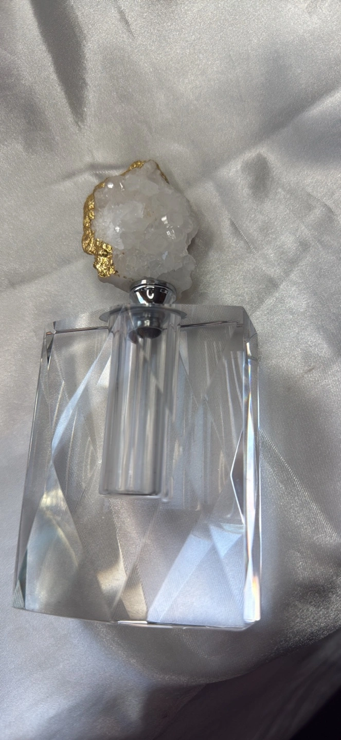 Firm on price . Elegant crystal perfume bottle. Features a unique quartz and gold stopper. Geometric, faceted design. Perfect for displaying favourite fragrance or as a decorative piece. Pick up in SE Mapleridge near Acadia