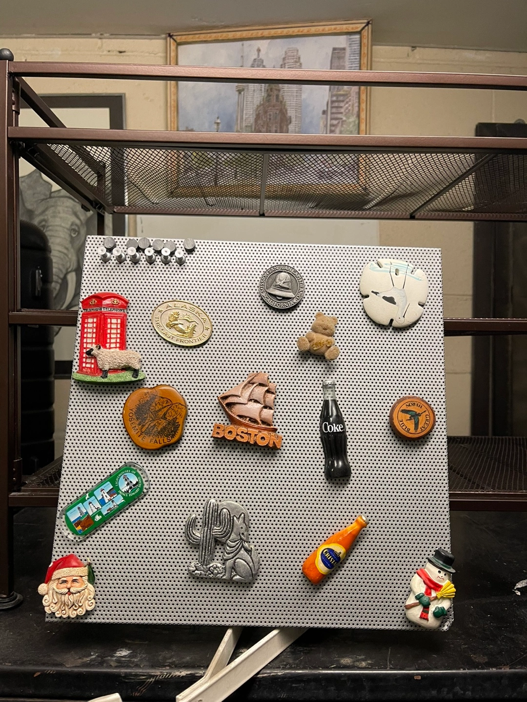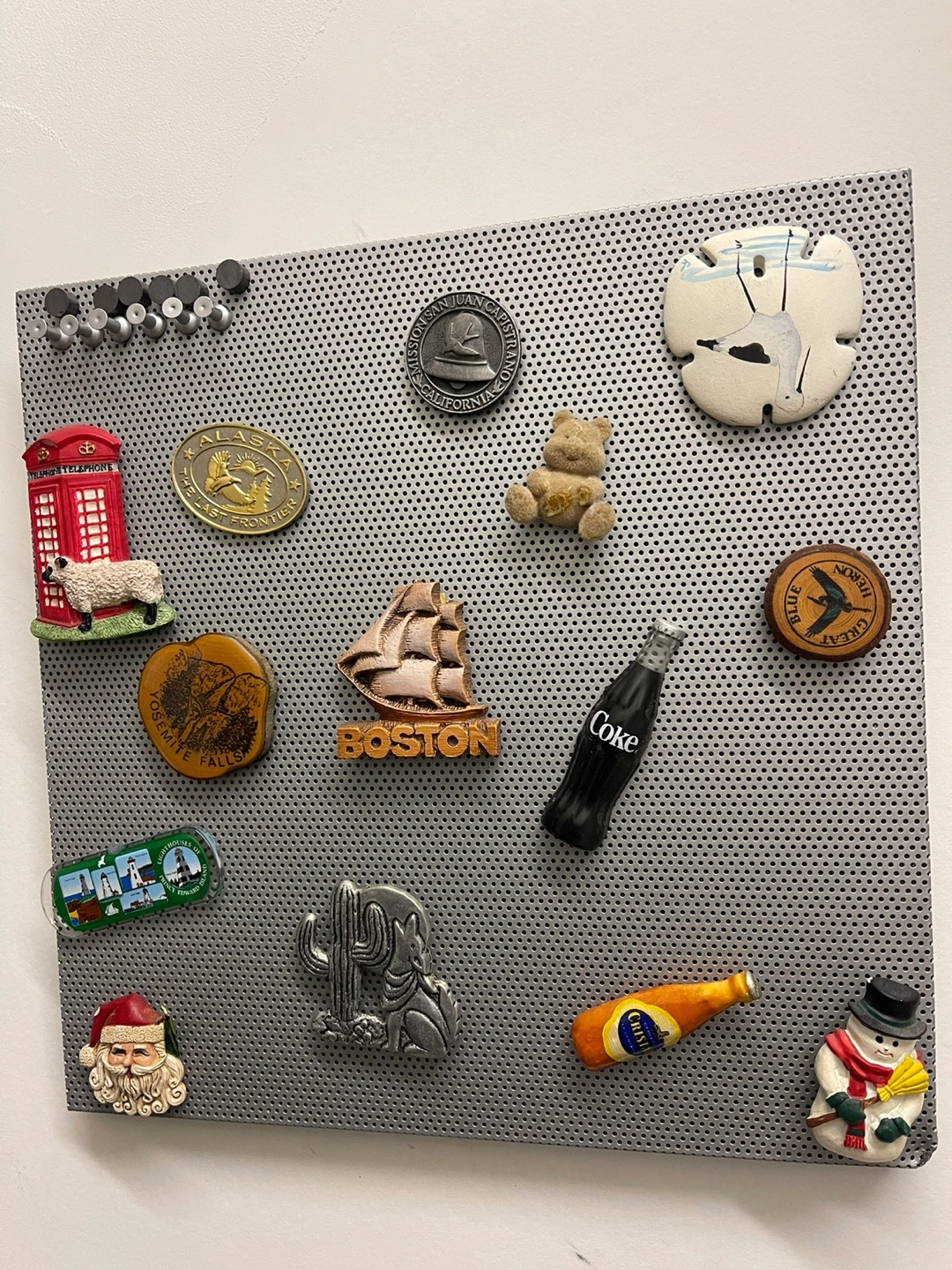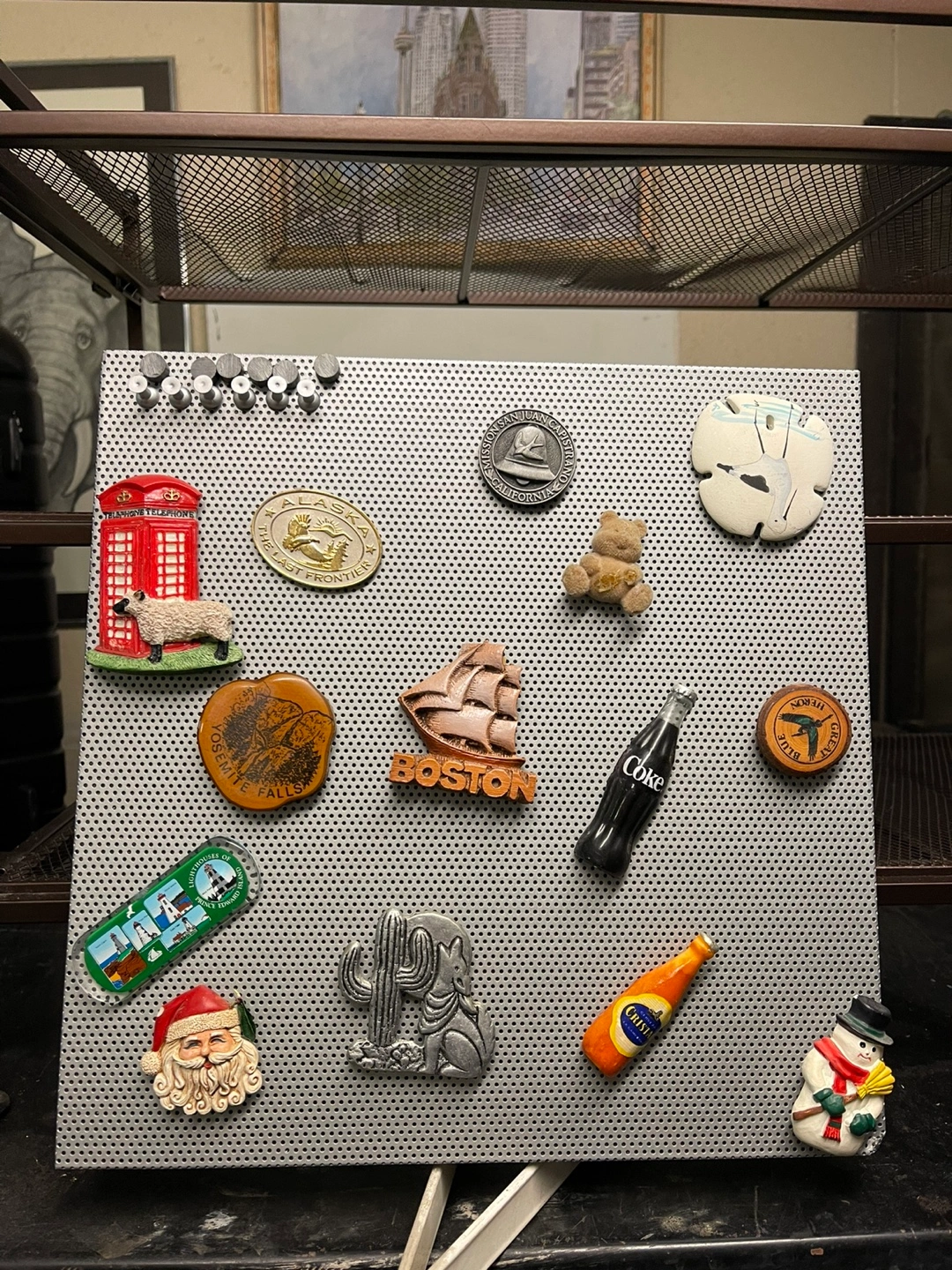 98Metal pegboard with various magnets attached. Souvenir magnets feature locations and images. Includes Coca-Cola and Molson Canadian magnets. Great for displaying mementos or organizing small items.