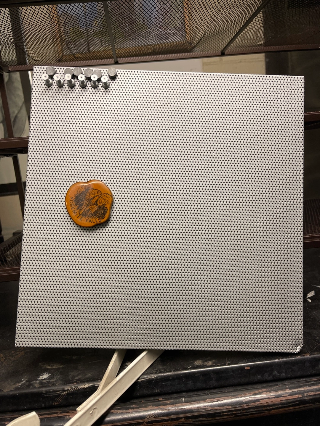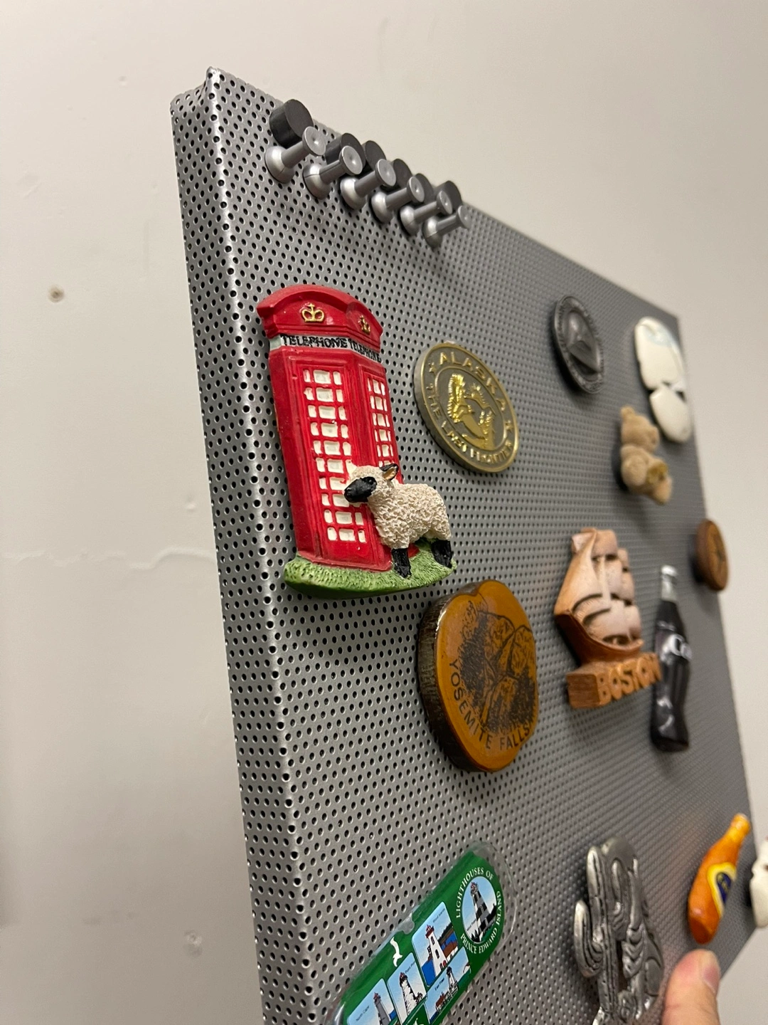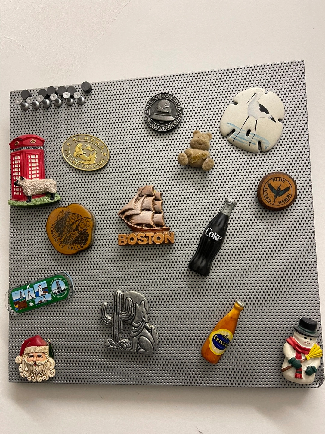 98Metal pegboard with various magnets attached. Souvenir magnets feature locations and images. Includes Coca-Cola and Molson Canadian magnets. Great for displaying mementos or organizing small items.