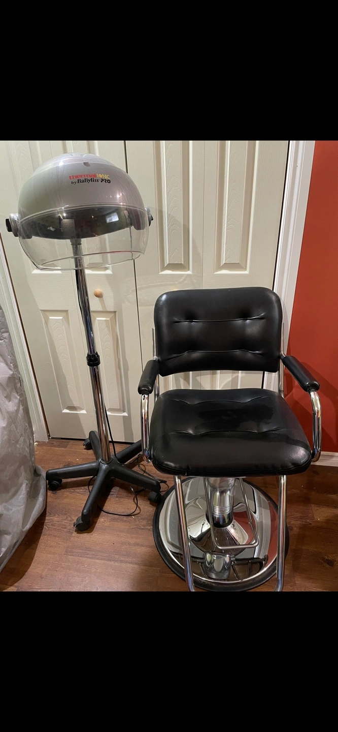 Salon-quality hooded dryer and styling chair. Perfect for home use. Portable and easy to assemble. $75 each . Salon hair dryer and hydraulic chair, perfect for a home salon set up excellent condition